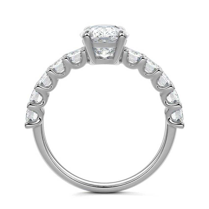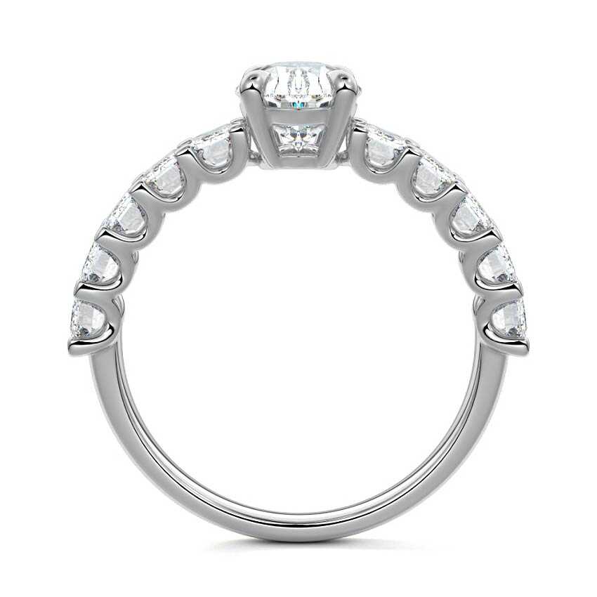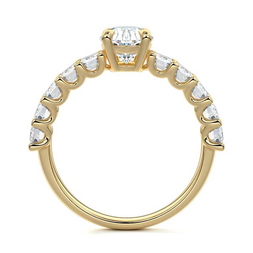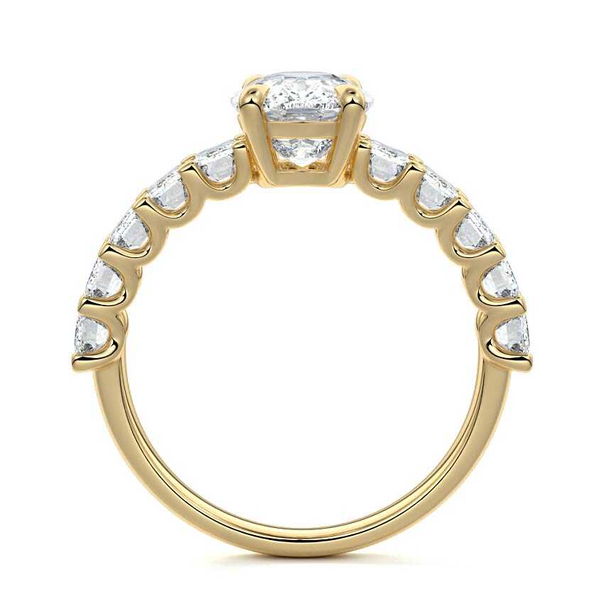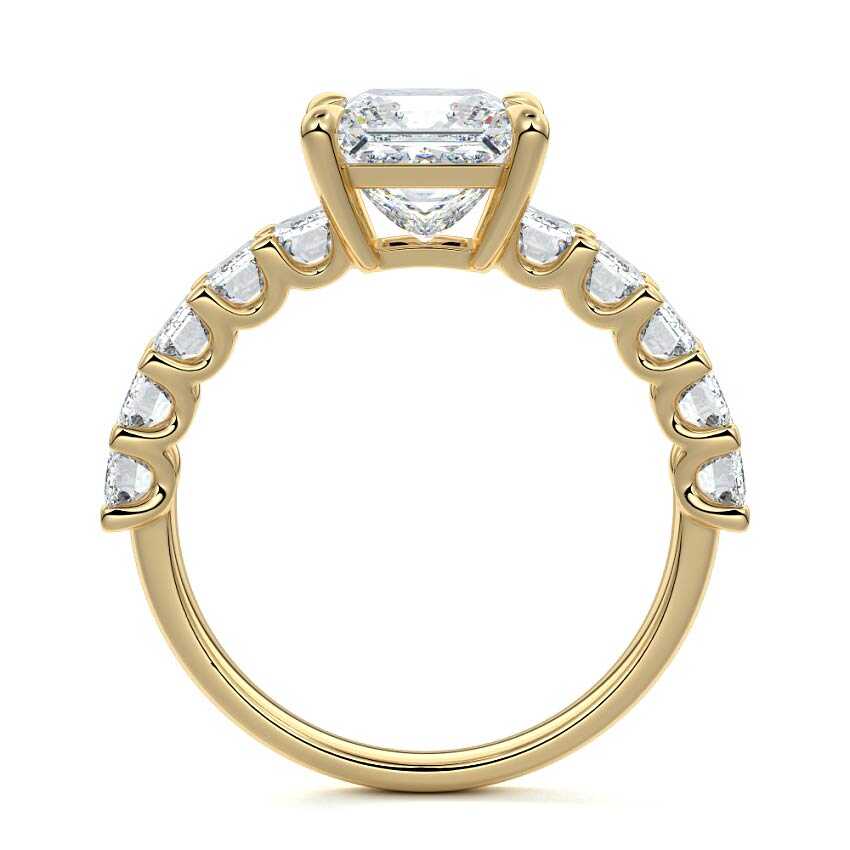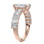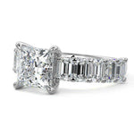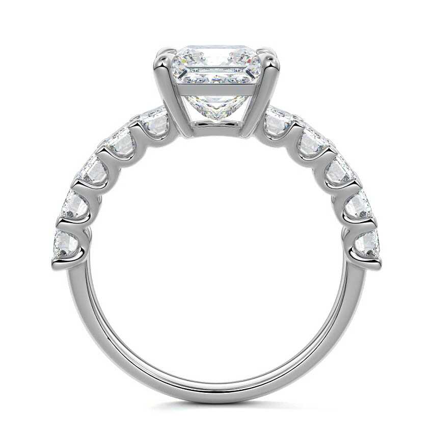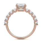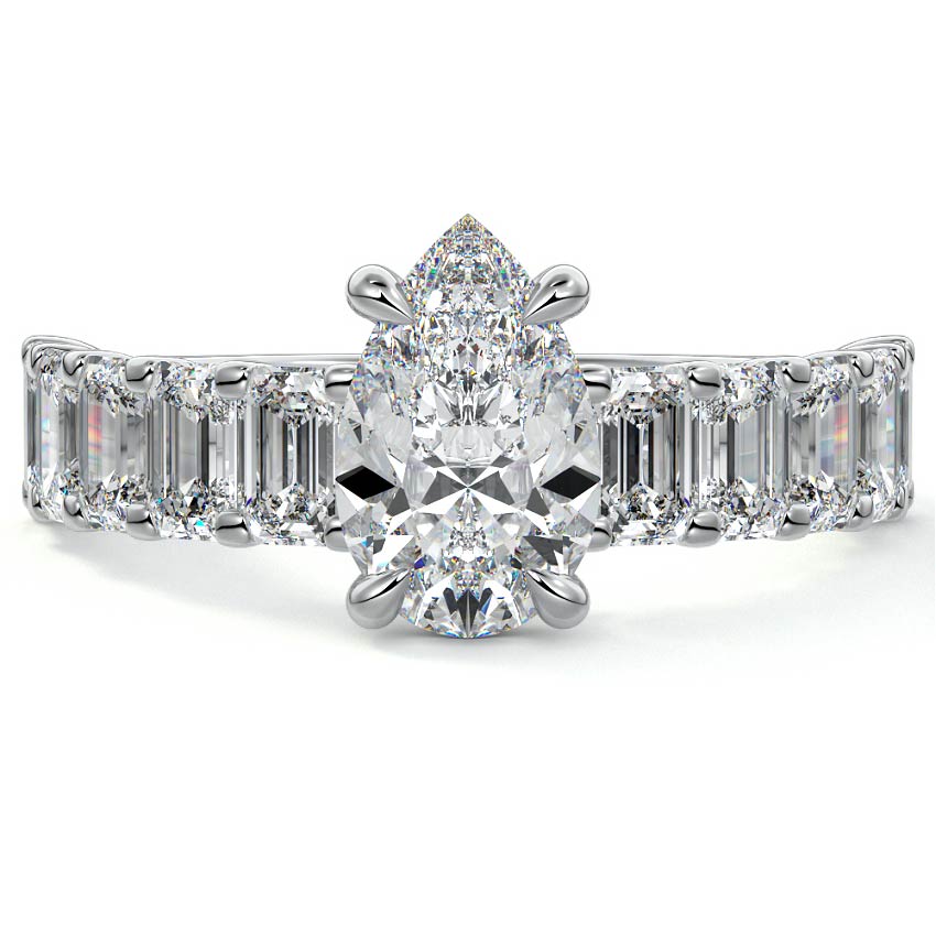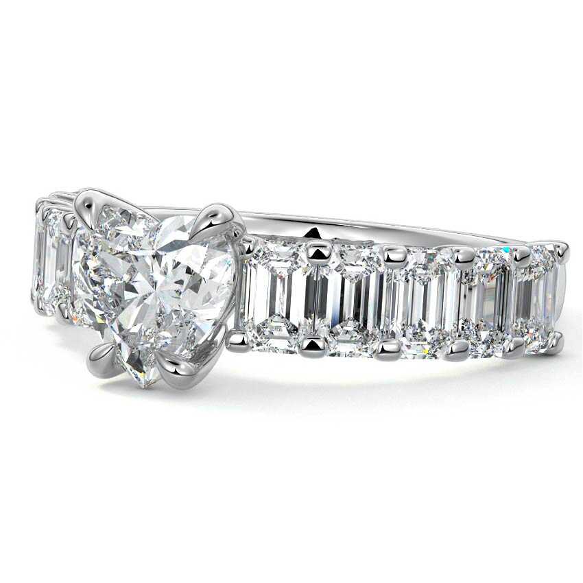 This stunning engagement ring features a half-way band set with sparkling emerald-cut diamonds, creating a breathtakingly elegant design. The elongated shape of the emerald diamonds lends a modern touch while enhancing the ring's overall clarity and brilliance. The half-way setting allows for an unobstructed view of the center stone, ensuring the entire ring has an ice-clear appearance. Perfect for those who appreciate unique, sophisticated jewelry, this ring is a striking symbol of love and commitment.