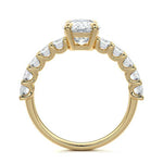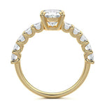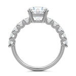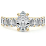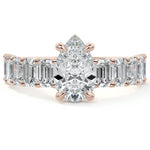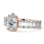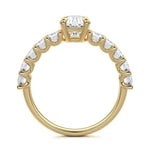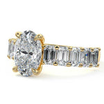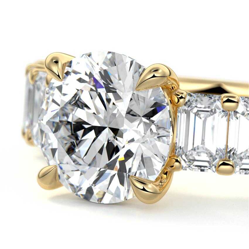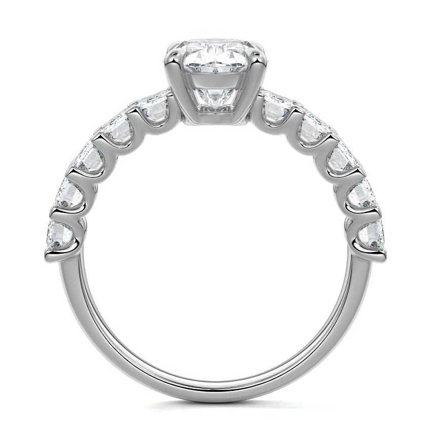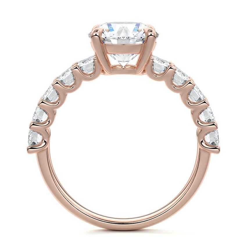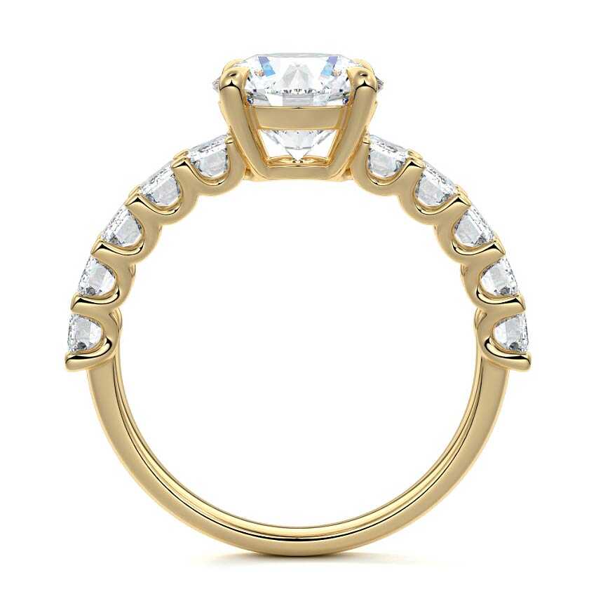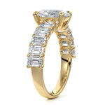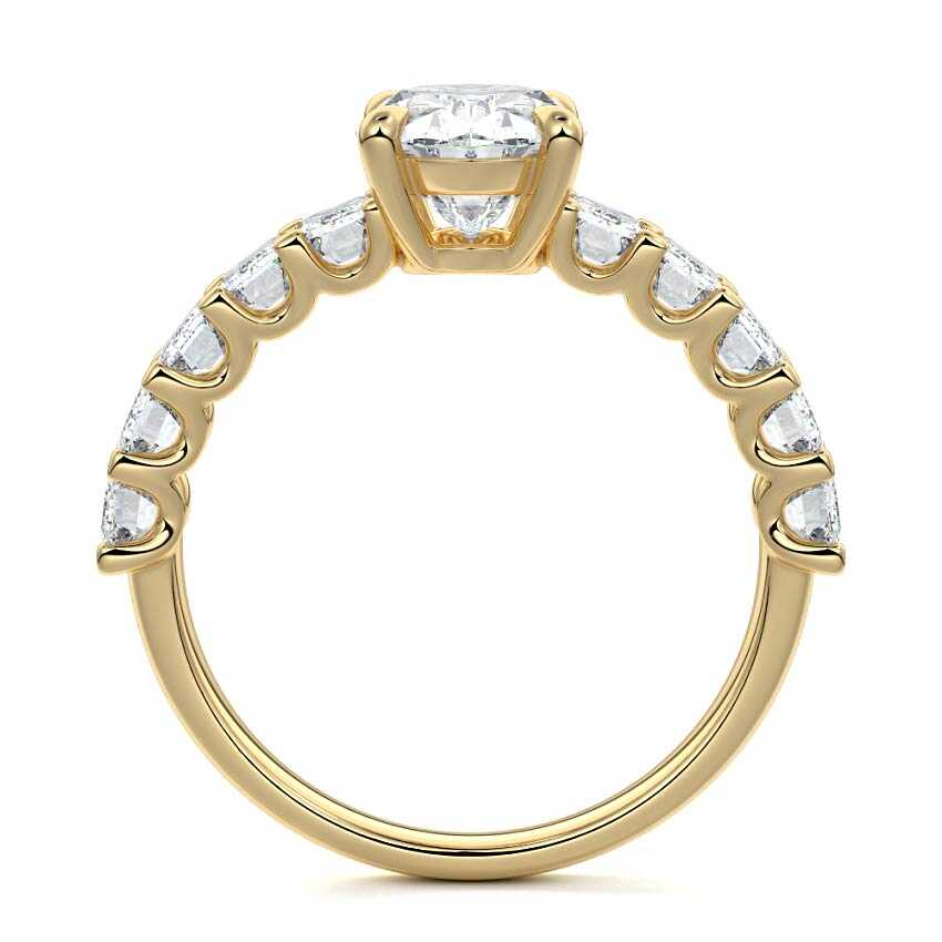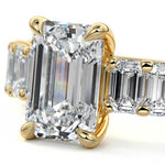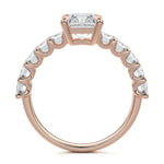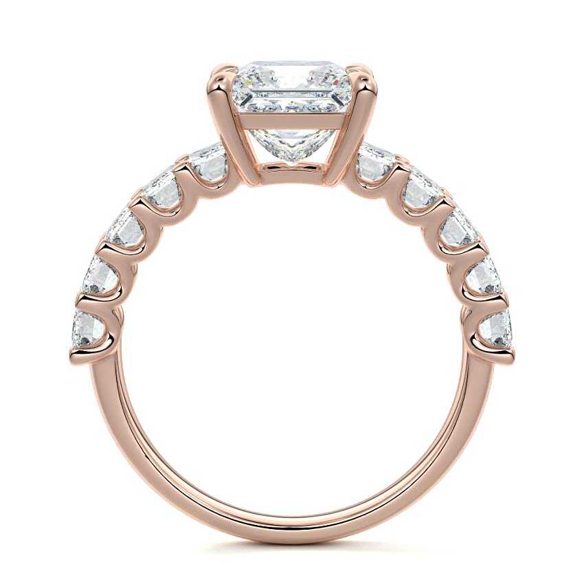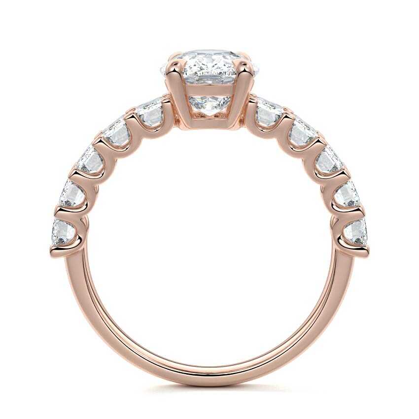This stunning engagement ring features a half-way band set with sparkling emerald-cut diamonds, creating a breathtakingly elegant design. The elongated shape of the emerald diamonds lends a modern touch while enhancing the ring's overall clarity and brilliance. The half-way setting allows for an unobstructed view of the center stone, ensuring the entire ring has an ice-clear appearance. Perfect for those who appreciate unique, sophisticated jewelry, this ring is a striking symbol of love and commitment.