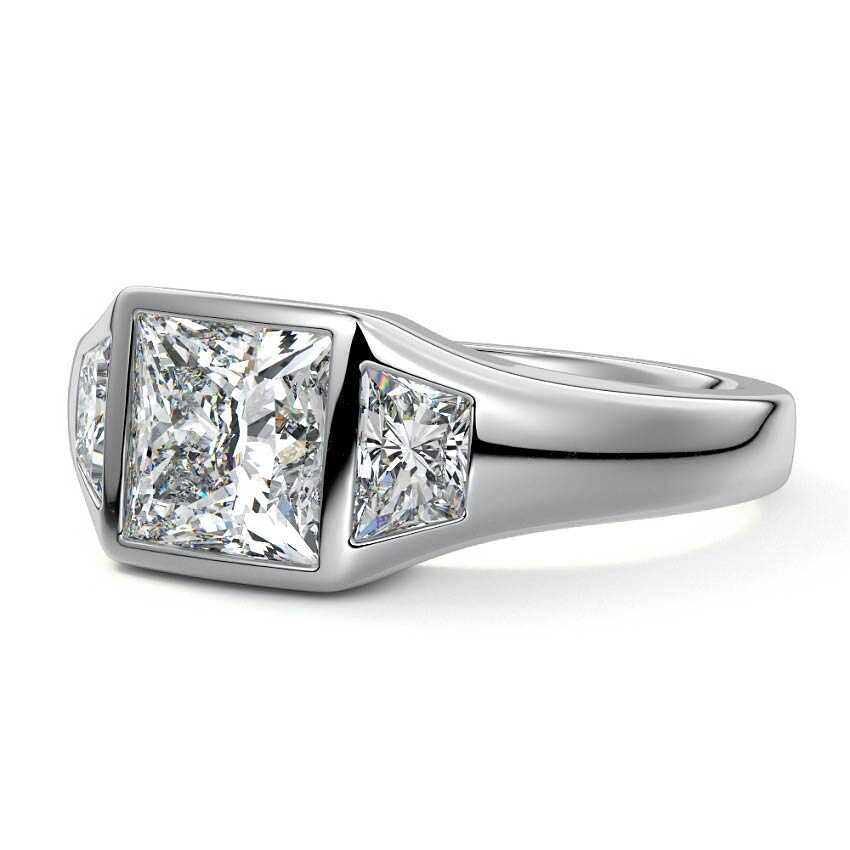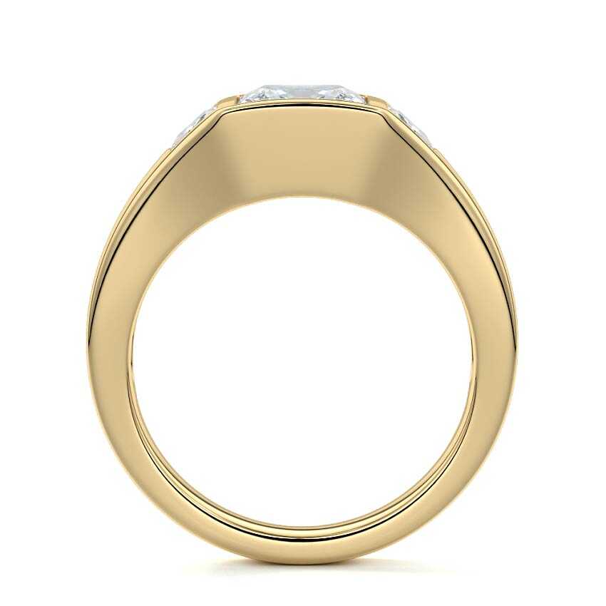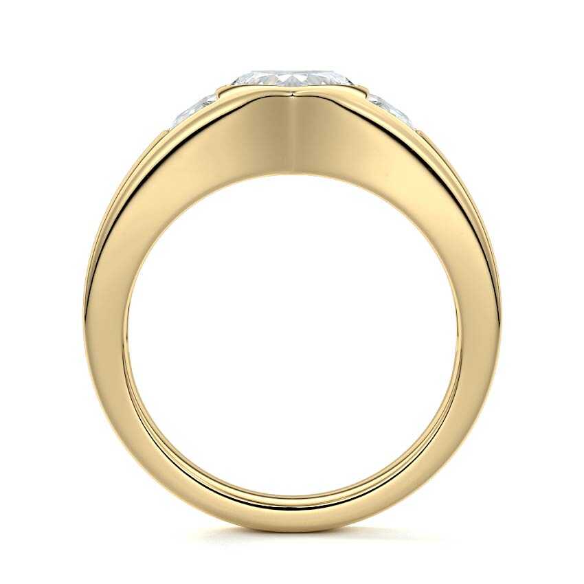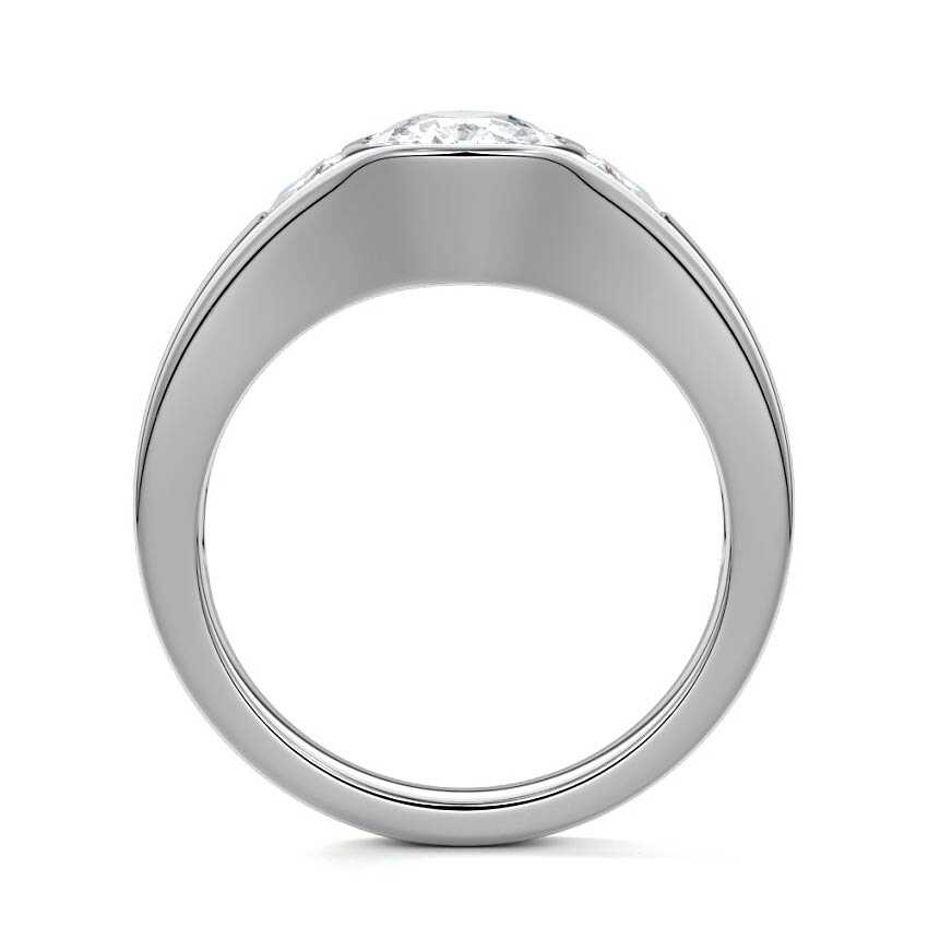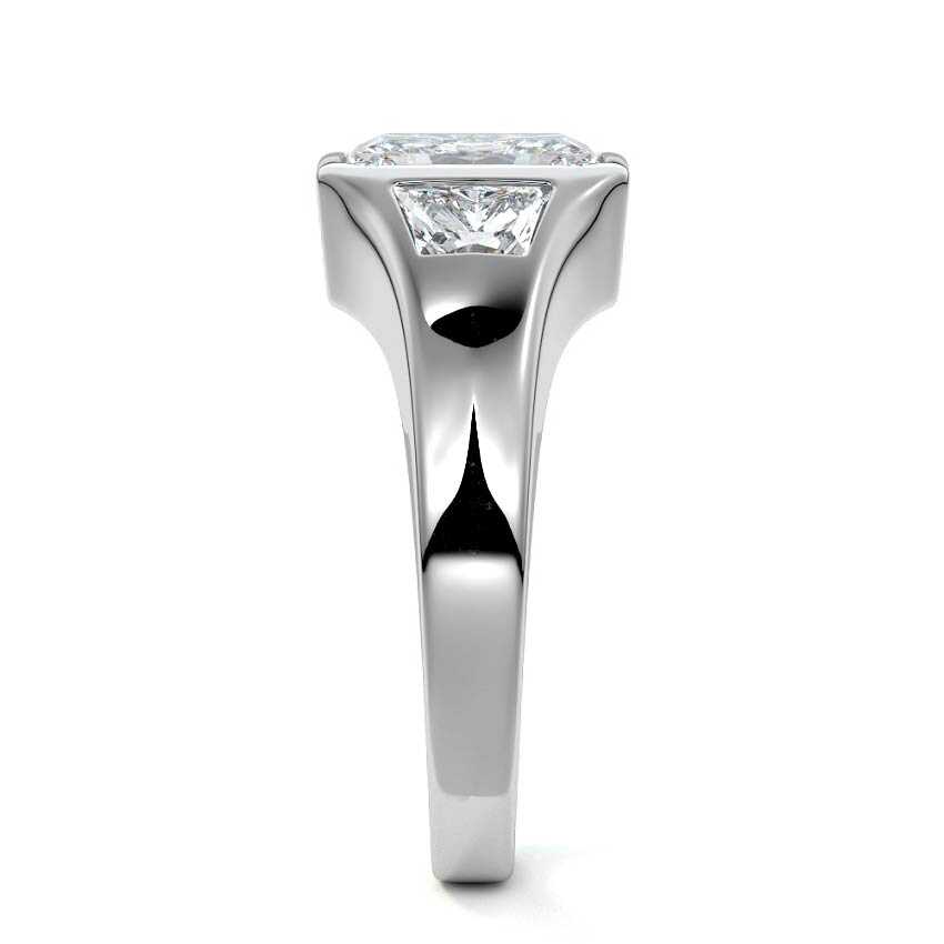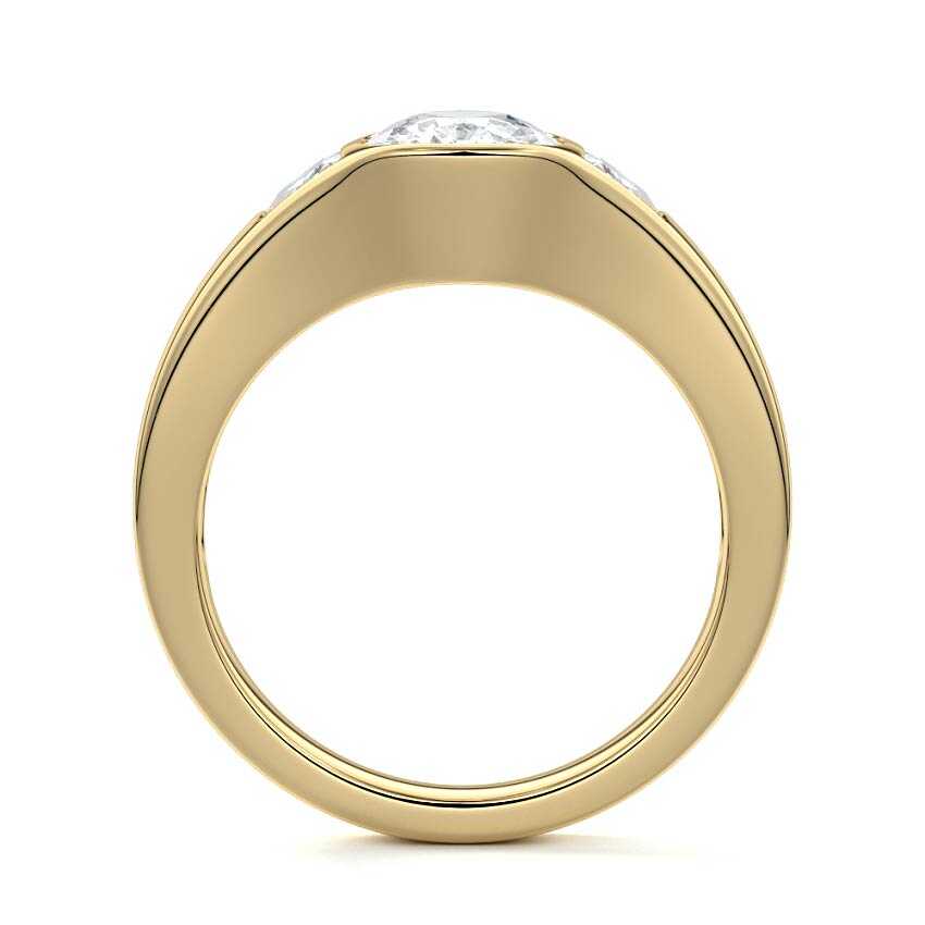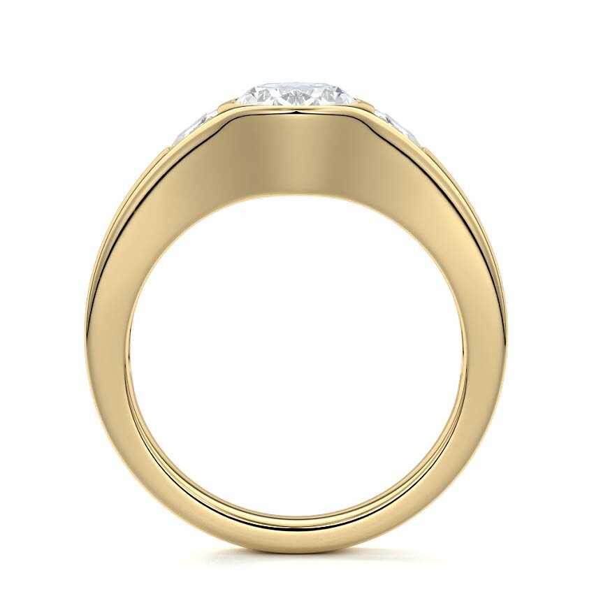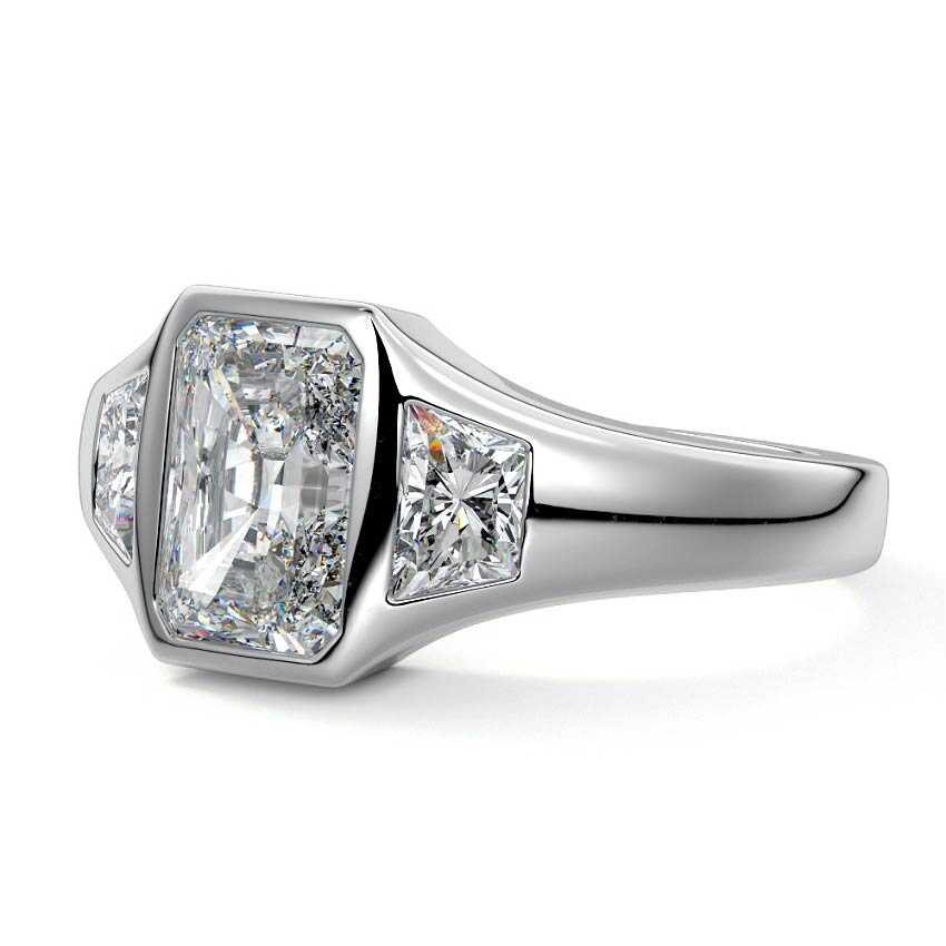 This chunky three-stone bezel engagement ring features a bold and modern design that makes a striking statement. Each stone is securely held in a sleek bezel setting, which not only enhances their brilliance but also provides a smooth, contemporary look. The substantial width of the band adds to the ring's robust character, while the three stones symbolize a beautiful journey—past, present, and future. Ideal for those who appreciate unique and eye-catching jewelry, this ring perfectly balances elegance and strength.