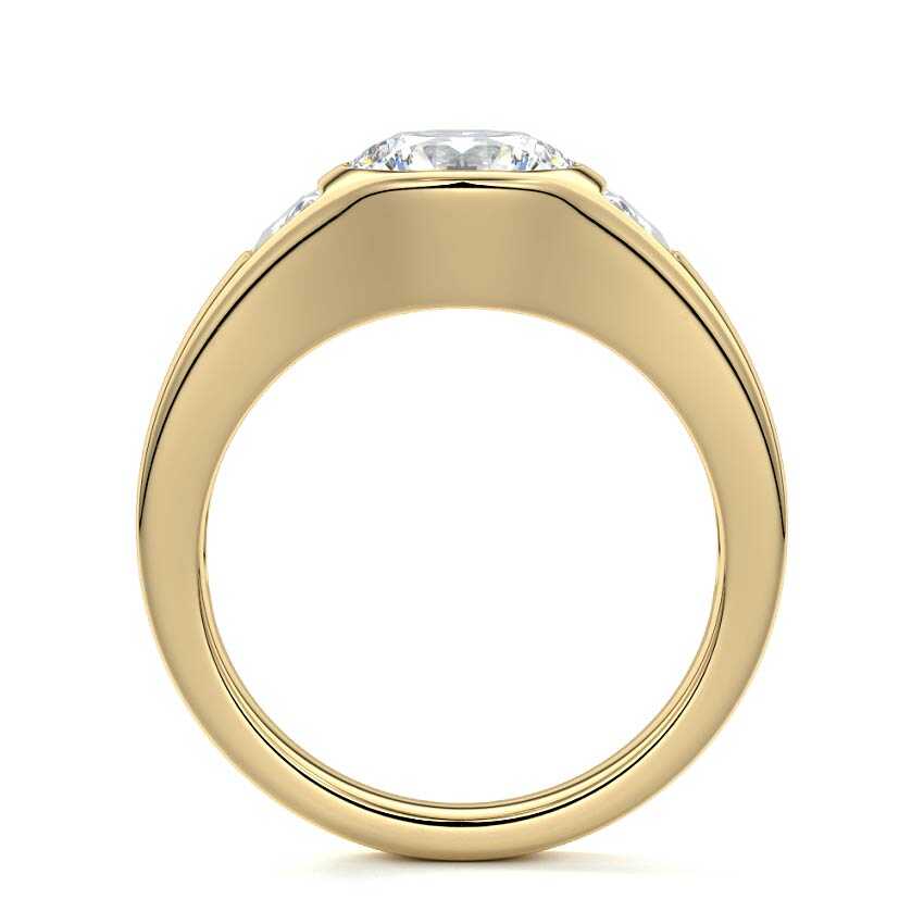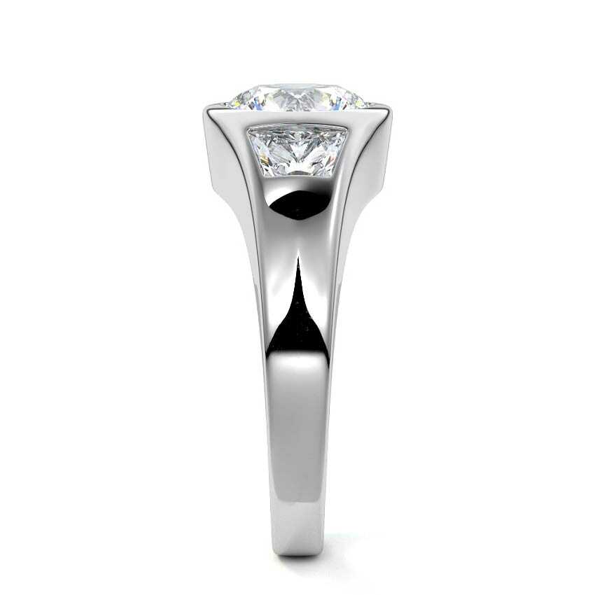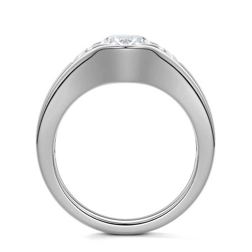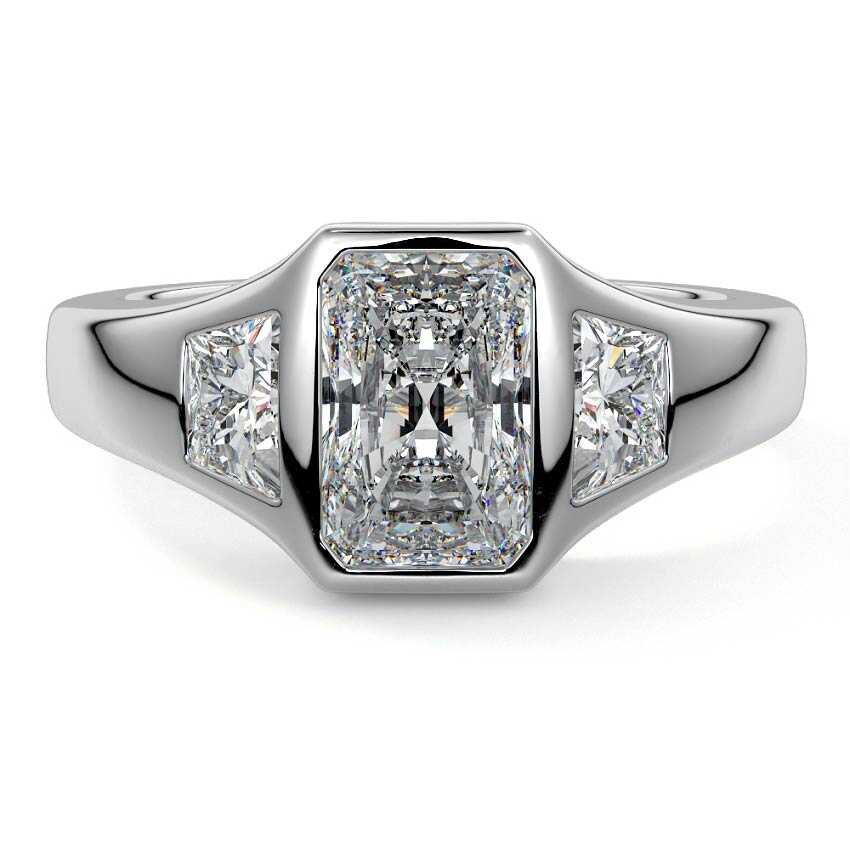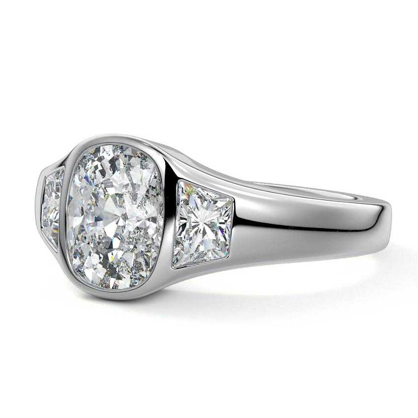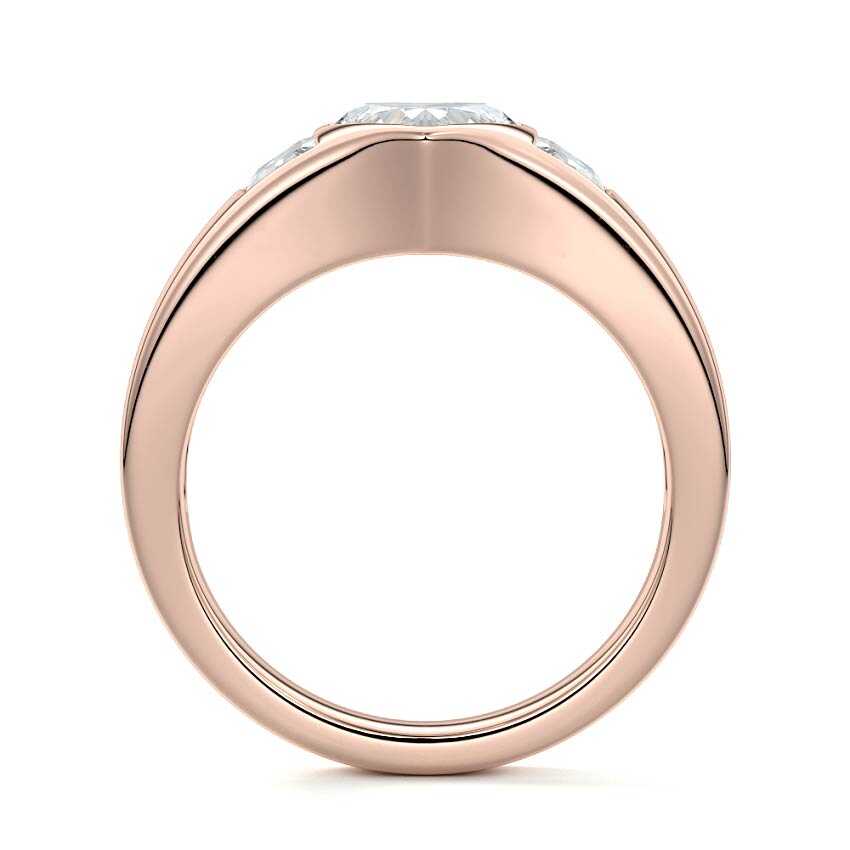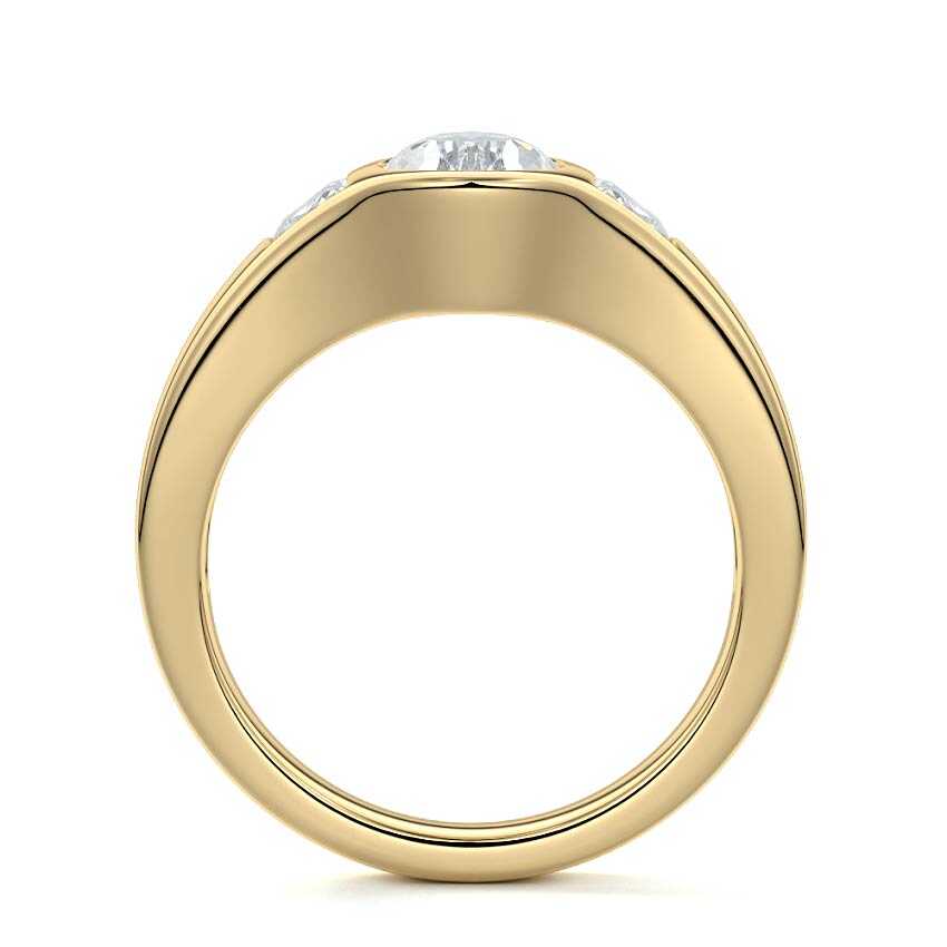 This chunky three-stone bezel engagement ring features a bold and modern design that makes a striking statement. Each stone is securely held in a sleek bezel setting, which not only enhances their brilliance but also provides a smooth, contemporary look. The substantial width of the band adds to the ring's robust character, while the three stones symbolize a beautiful journey—past, present, and future. Ideal for those who appreciate unique and eye-catching jewelry, this ring perfectly balances elegance and strength.
