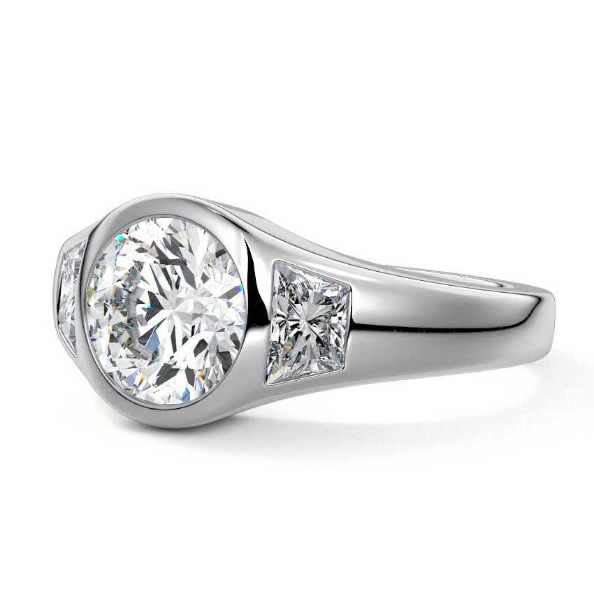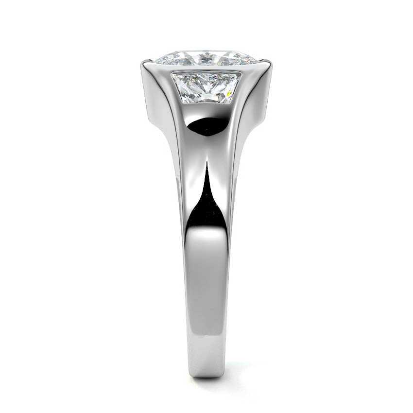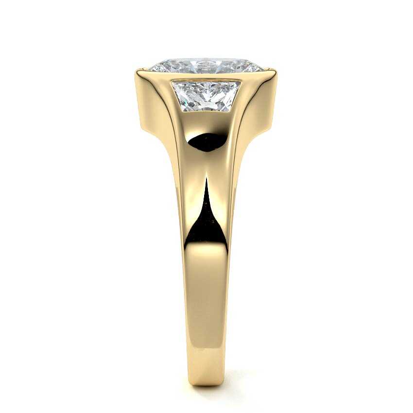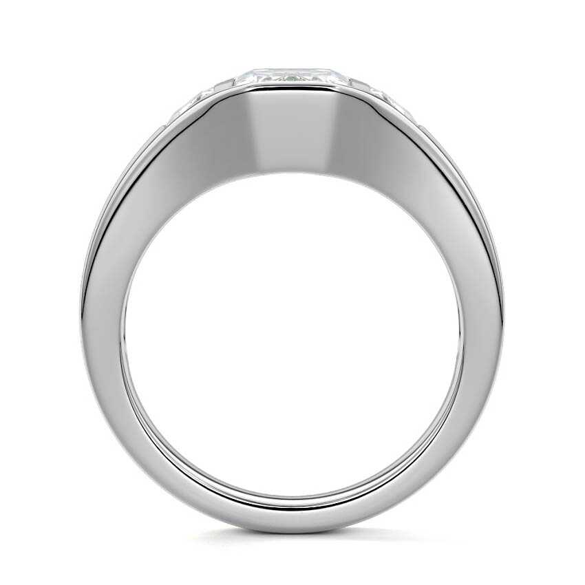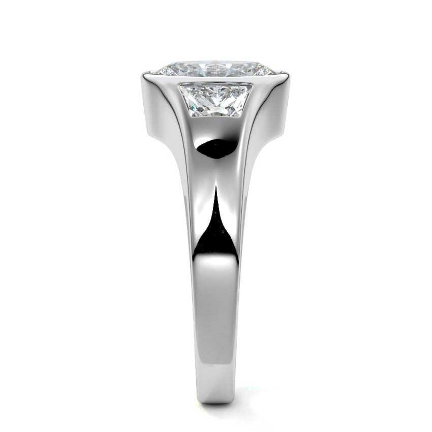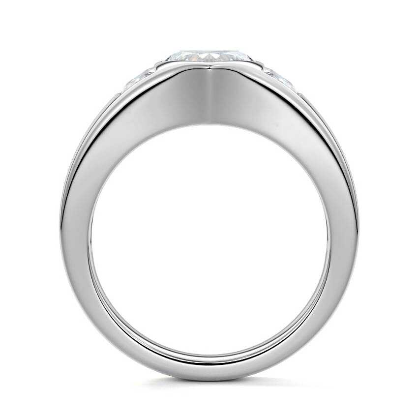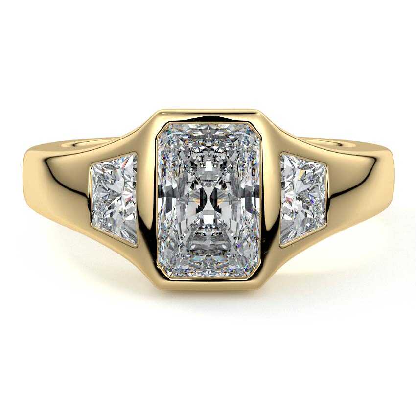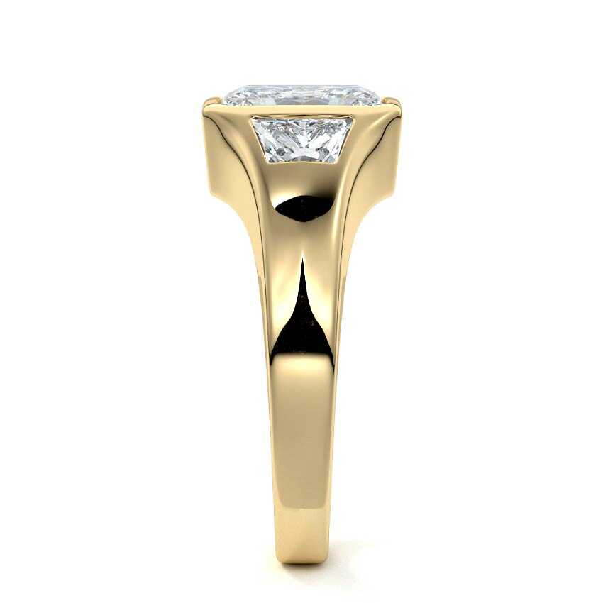 This chunky three-stone bezel engagement ring features a bold and modern design that makes a striking statement. Each stone is securely held in a sleek bezel setting, which not only enhances their brilliance but also provides a smooth, contemporary look. The substantial width of the band adds to the ring's robust character, while the three stones symbolize a beautiful journey—past, present, and future. Ideal for those who appreciate unique and eye-catching jewelry, this ring perfectly balances elegance and strength.