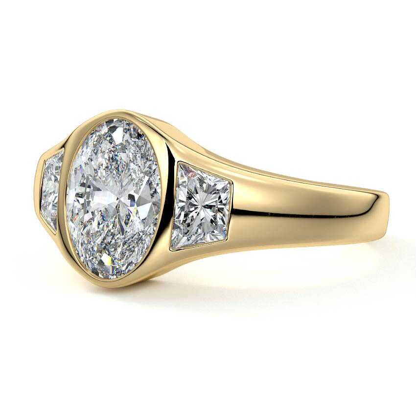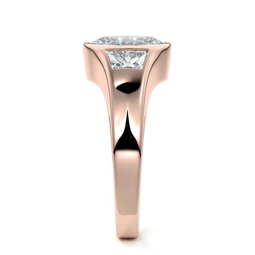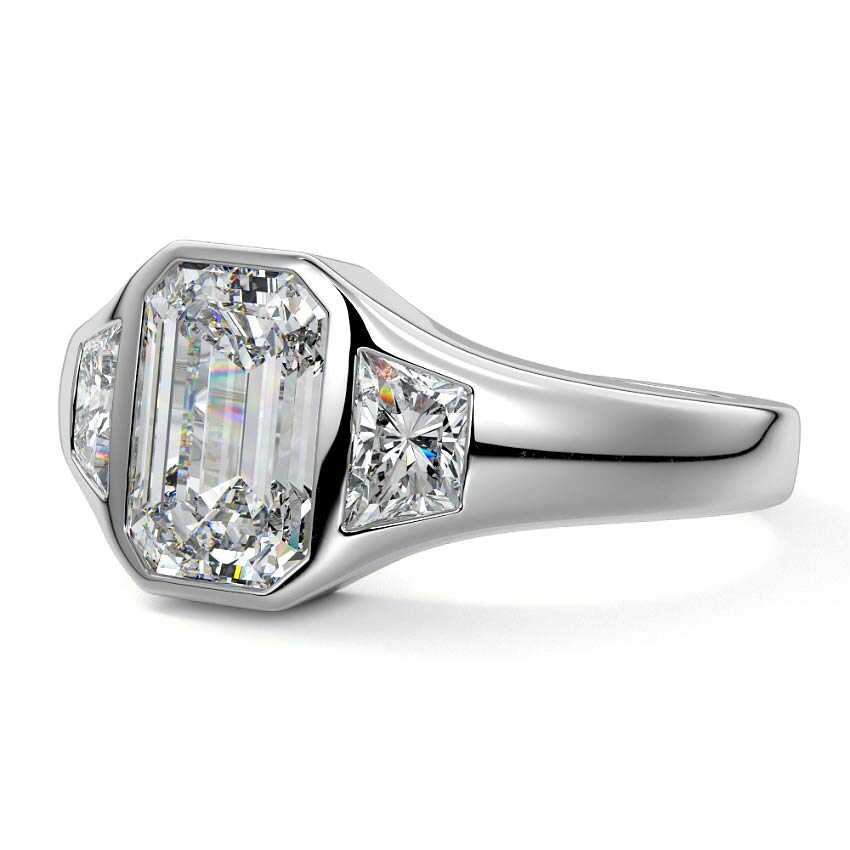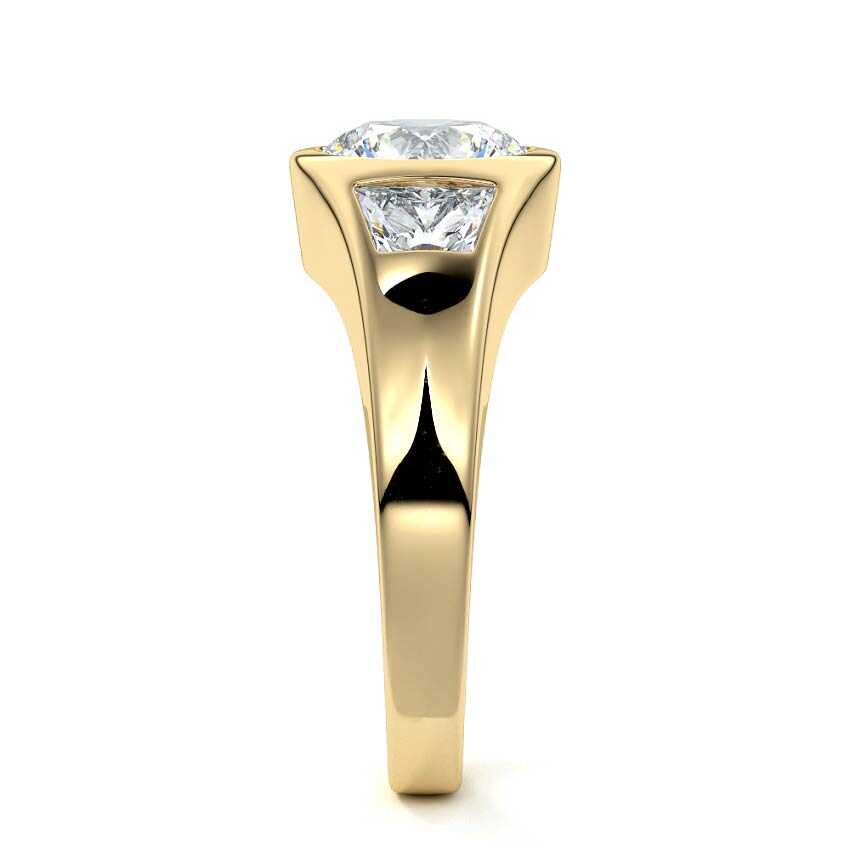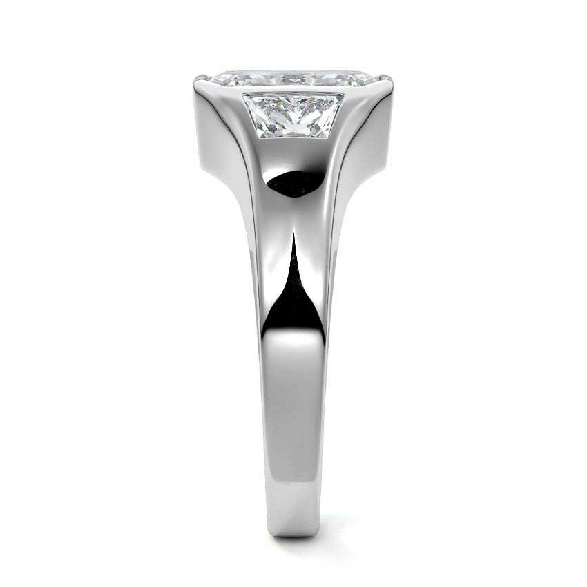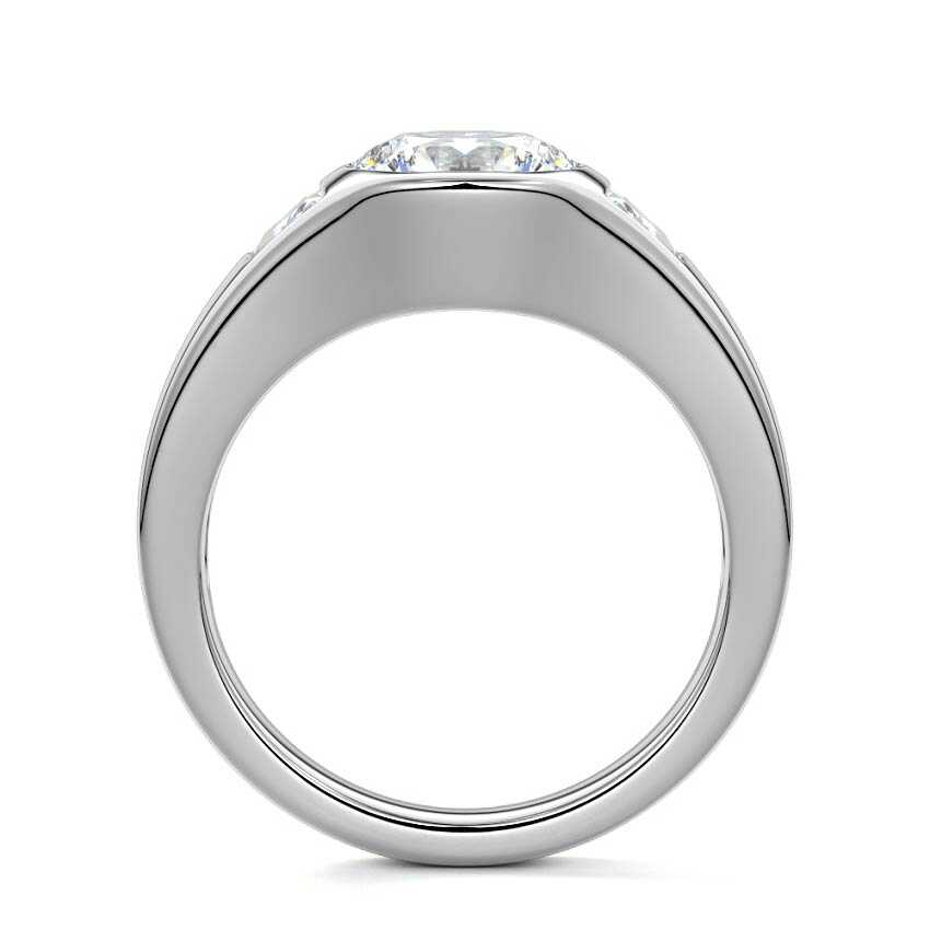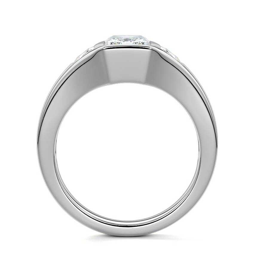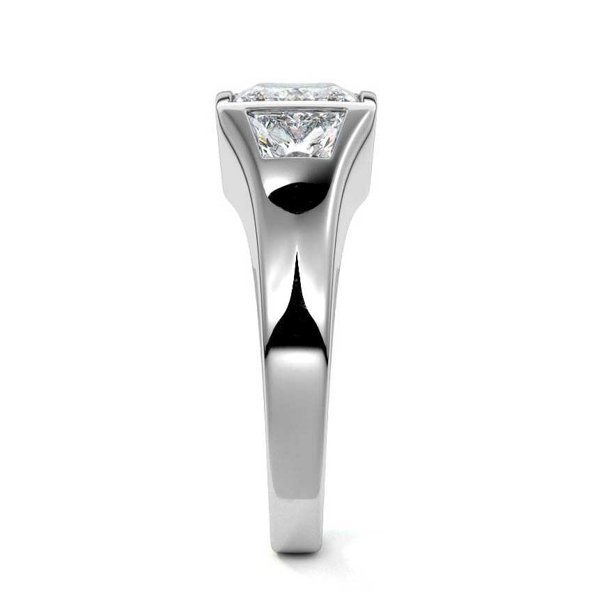 This chunky three-stone bezel engagement ring features a bold and modern design that makes a striking statement. Each stone is securely held in a sleek bezel setting, which not only enhances their brilliance but also provides a smooth, contemporary look. The substantial width of the band adds to the ring's robust character, while the three stones symbolize a beautiful journey—past, present, and future. Ideal for those who appreciate unique and eye-catching jewelry, this ring perfectly balances elegance and strength.