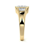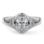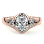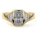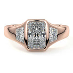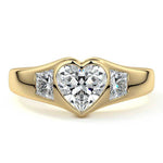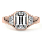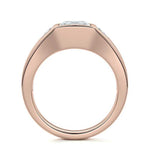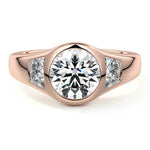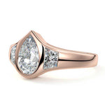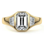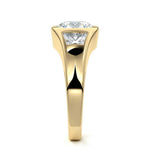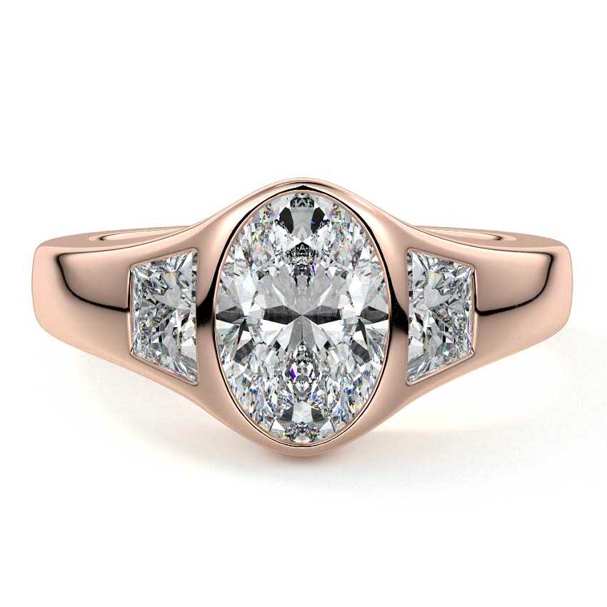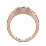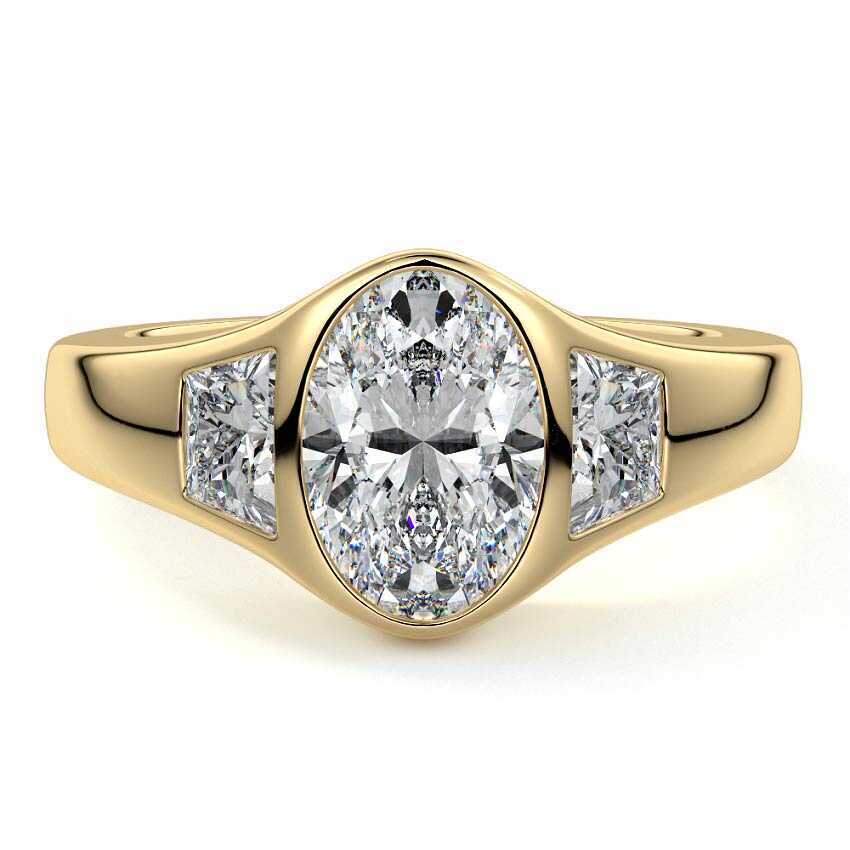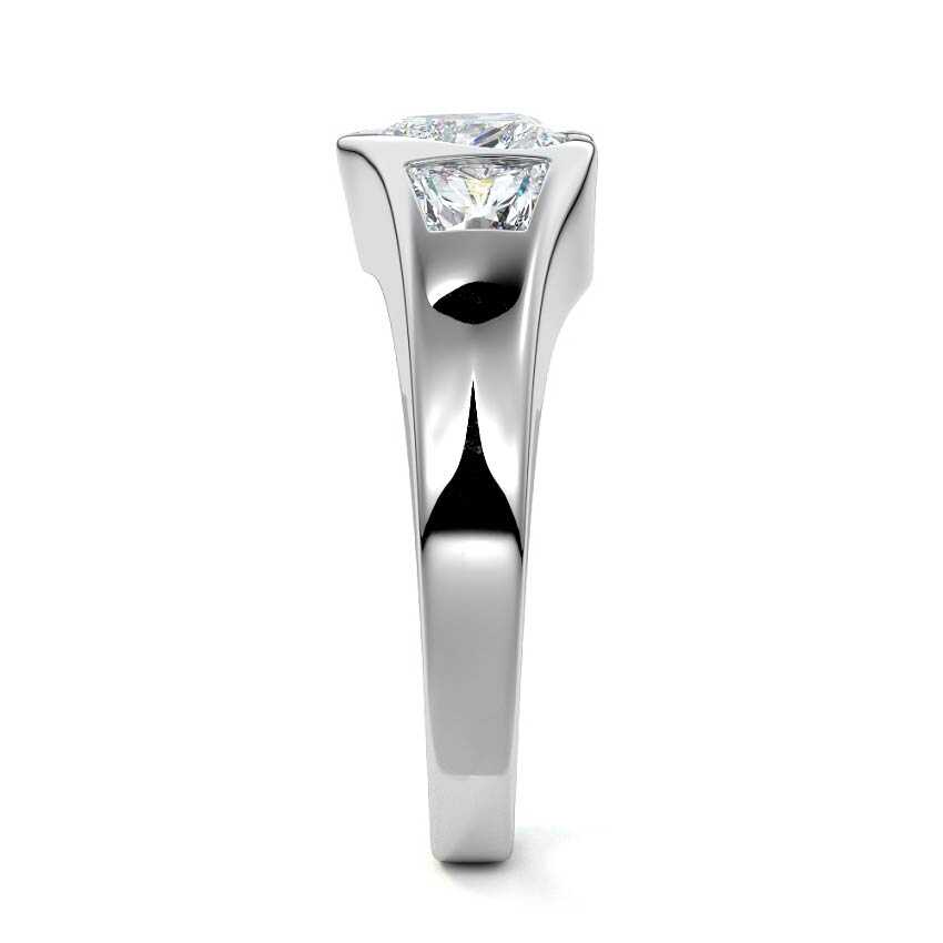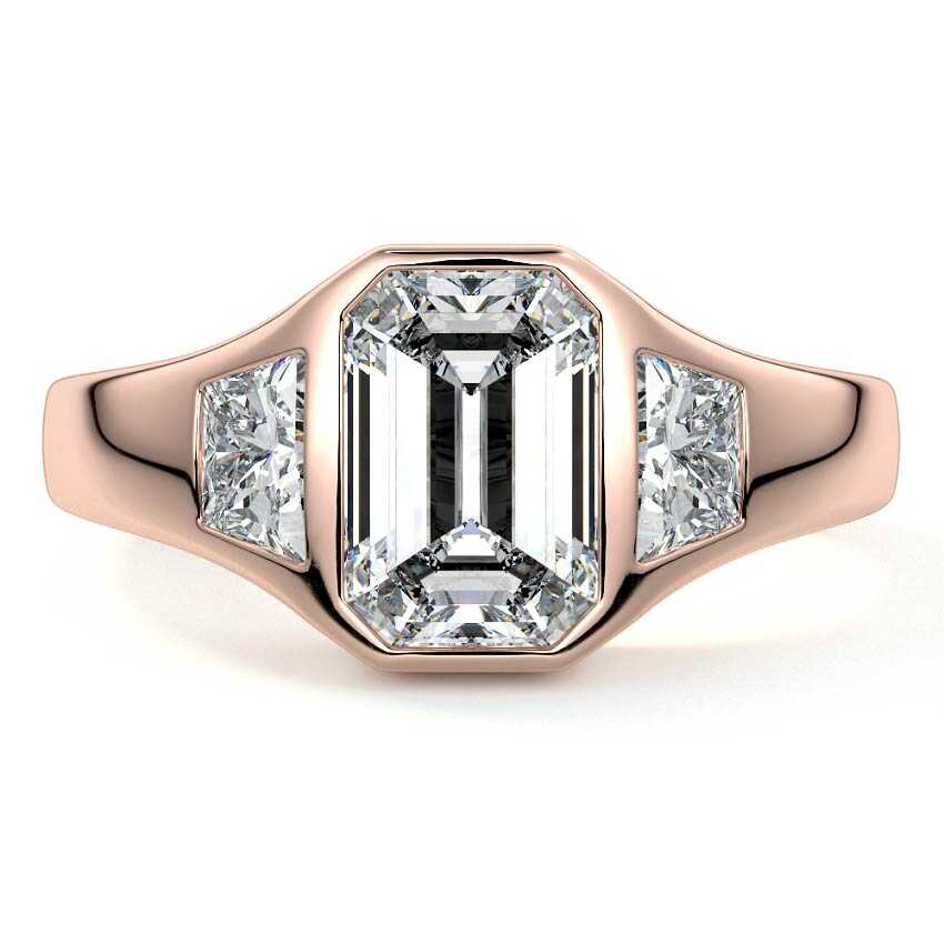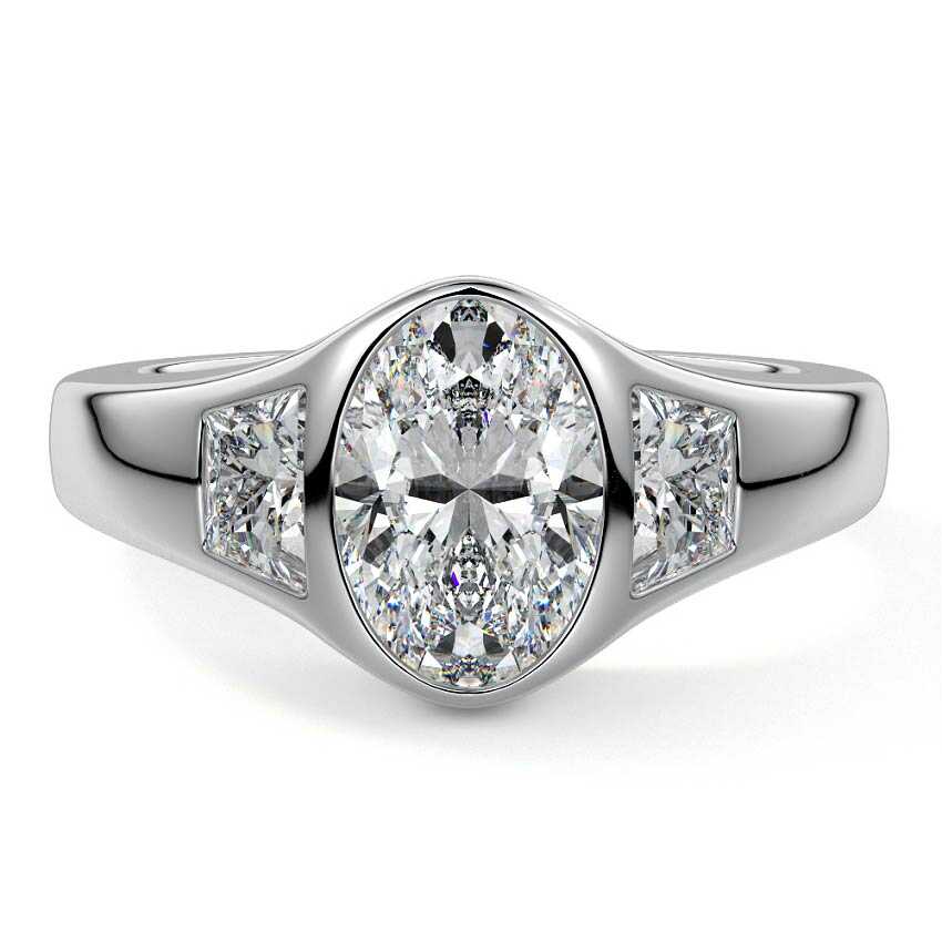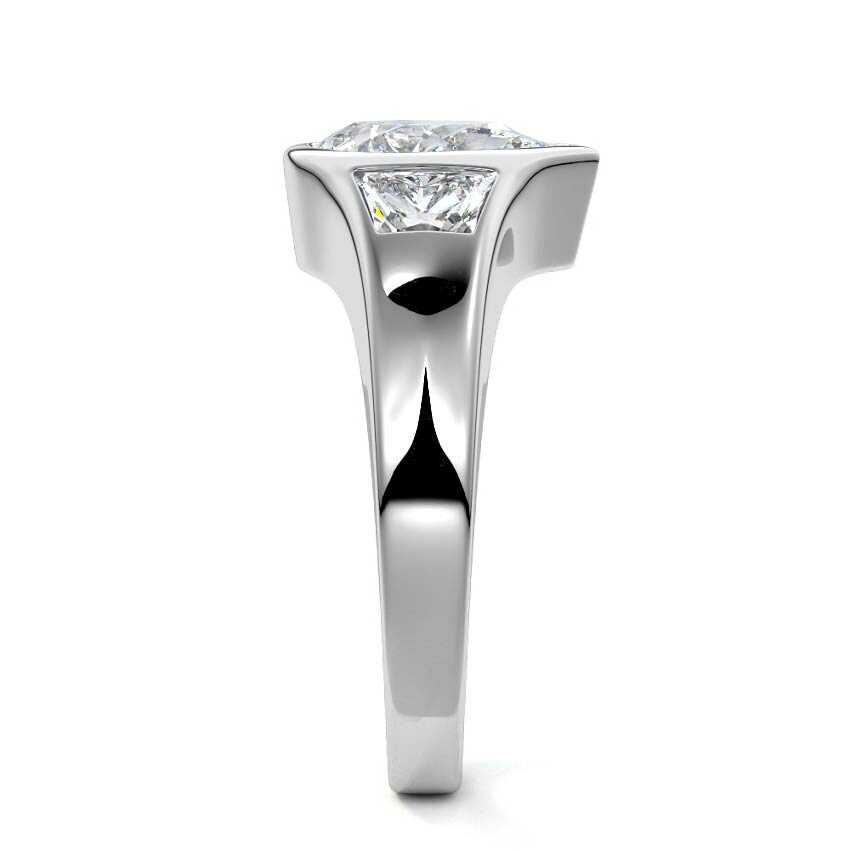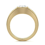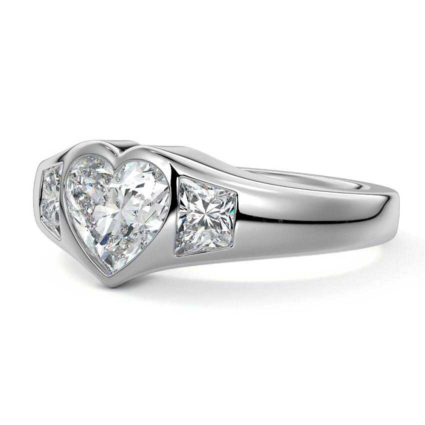 This chunky three-stone bezel engagement ring features a bold and modern design that makes a striking statement. Each stone is securely held in a sleek bezel setting, which not only enhances their brilliance but also provides a smooth, contemporary look. The substantial width of the band adds to the ring's robust character, while the three stones symbolize a beautiful journey—past, present, and future. Ideal for those who appreciate unique and eye-catching jewelry, this ring perfectly balances elegance and strength.