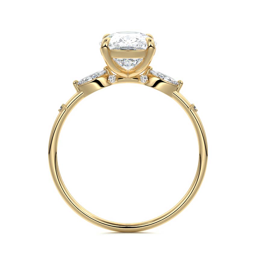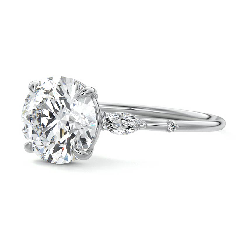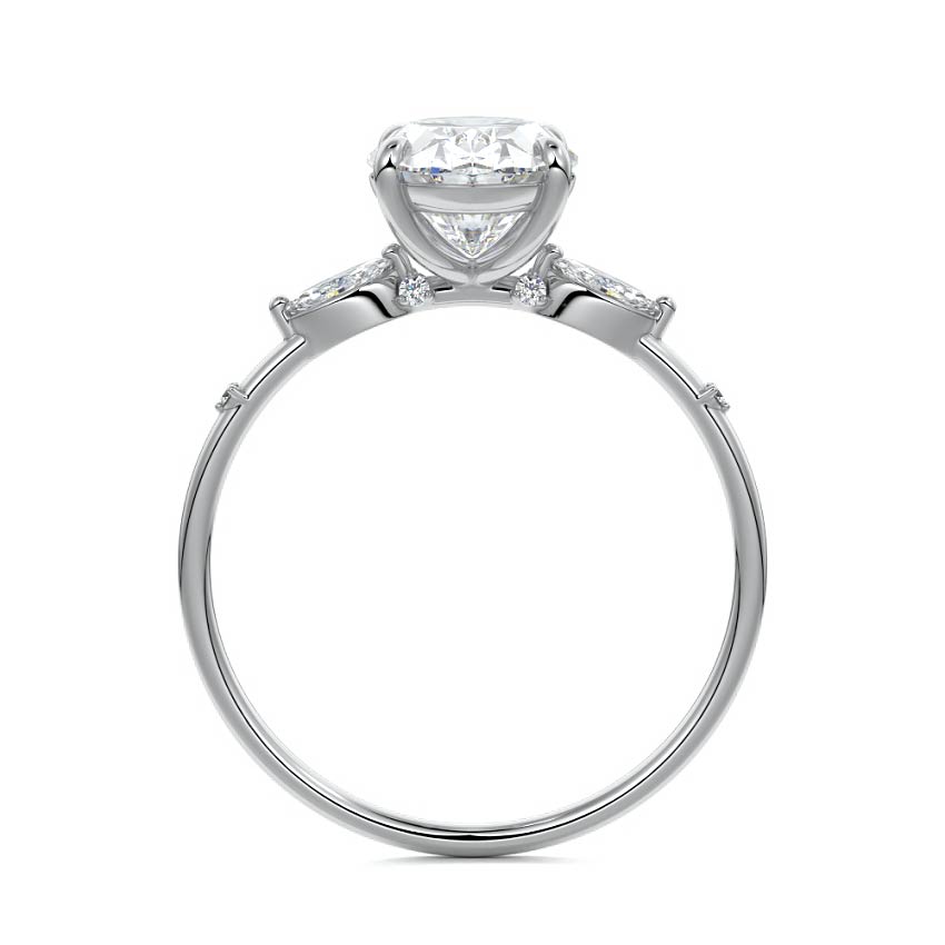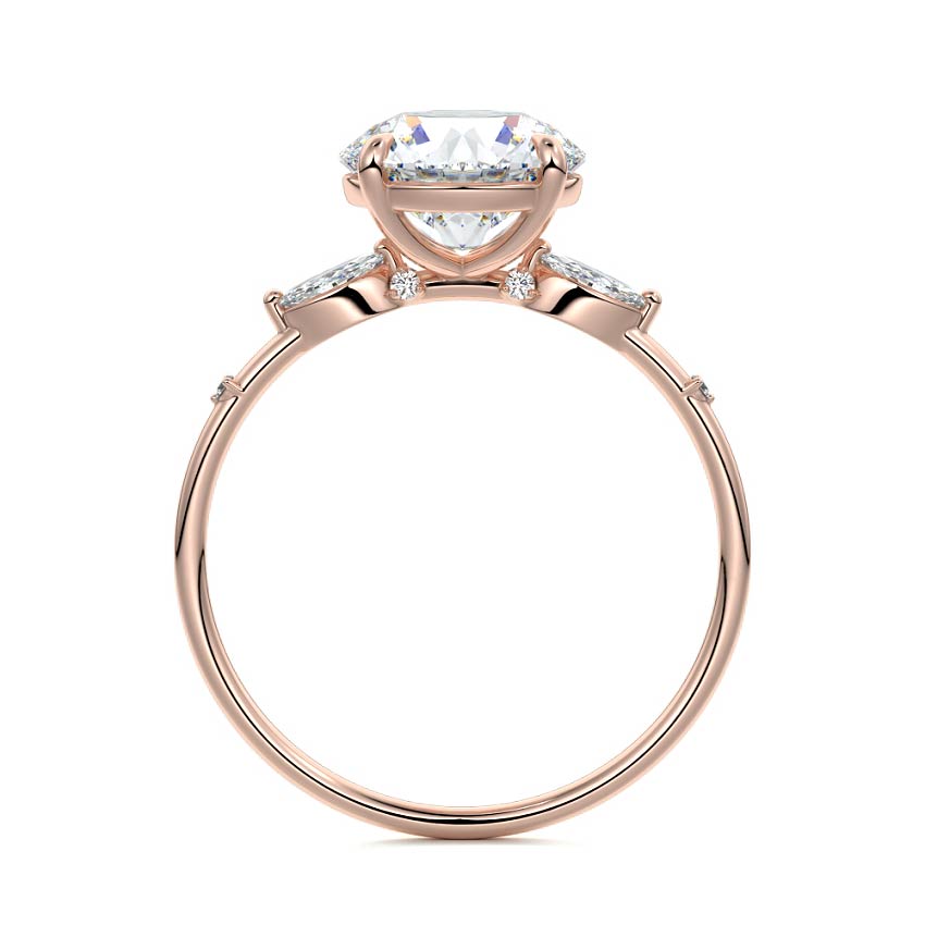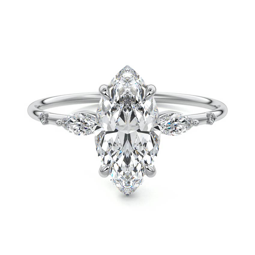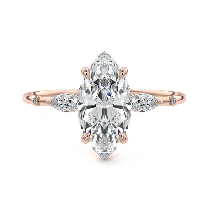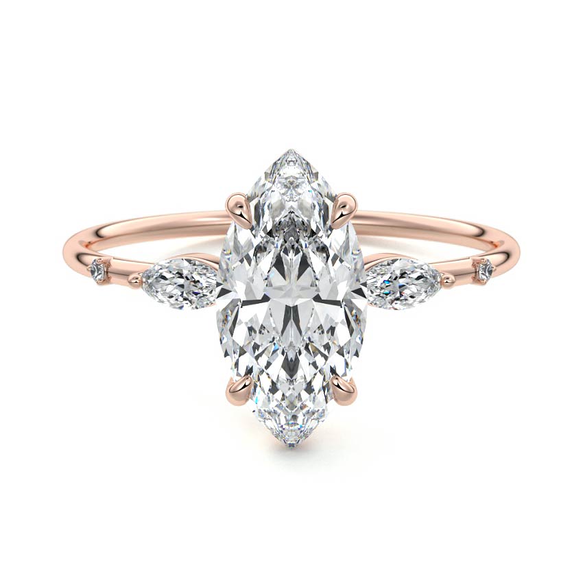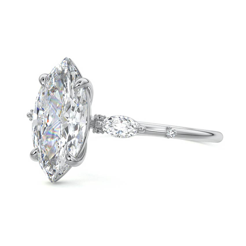 This setting showcases a center stone flanked by a alrger marquise cut diamond surrounded by an array of smaller round diamonds on both sides of the center stone, meticulously arranged in a perfectly symmetrical and harmonious pattern.