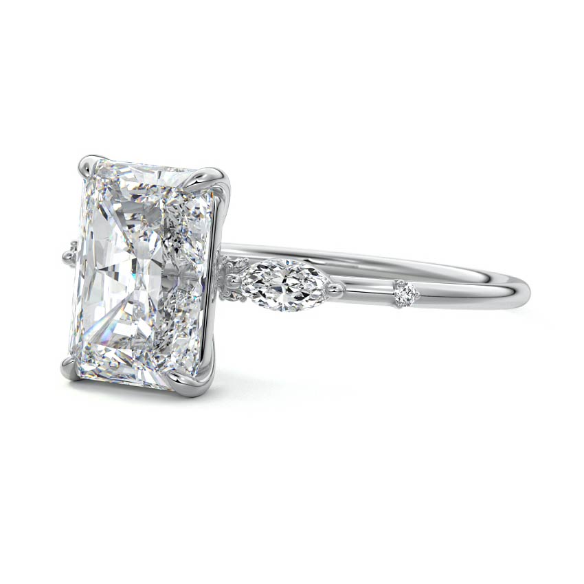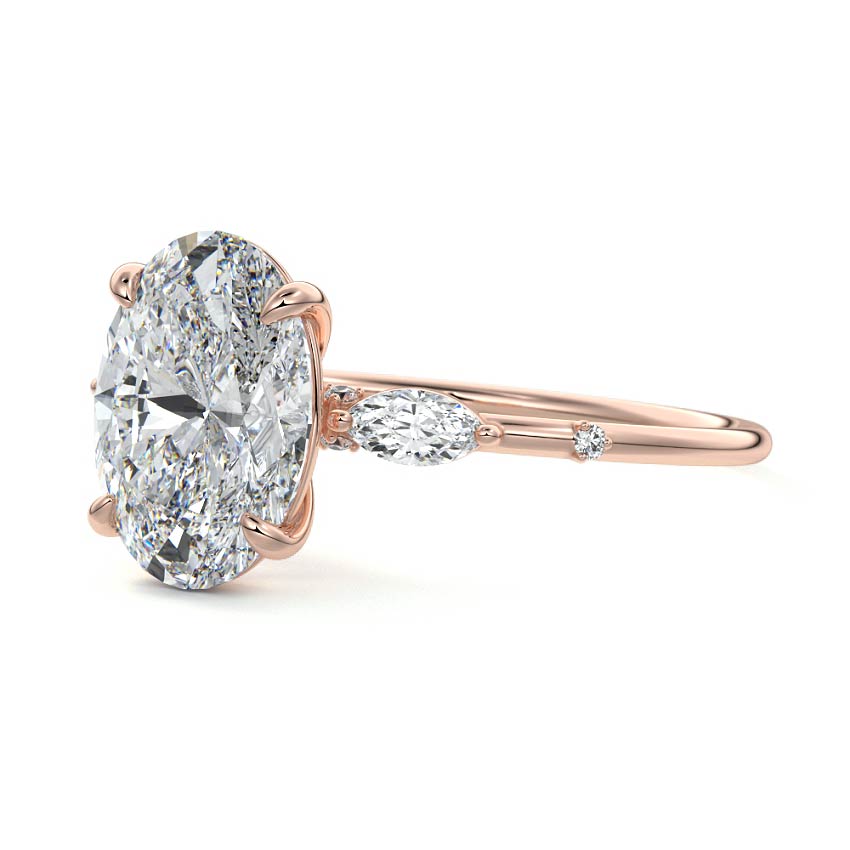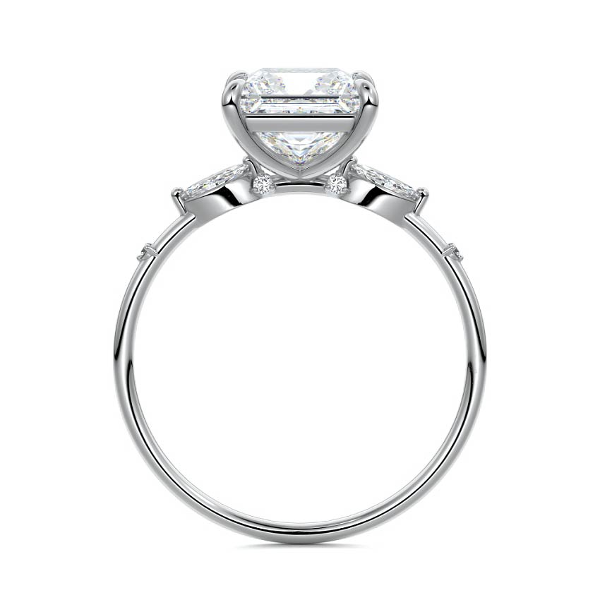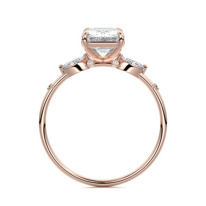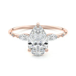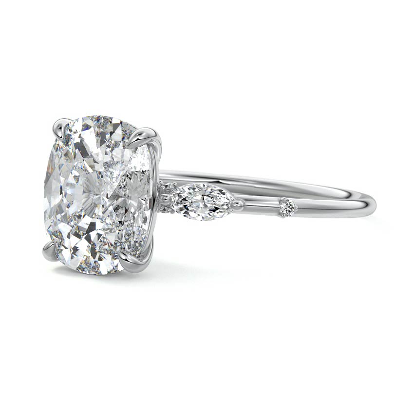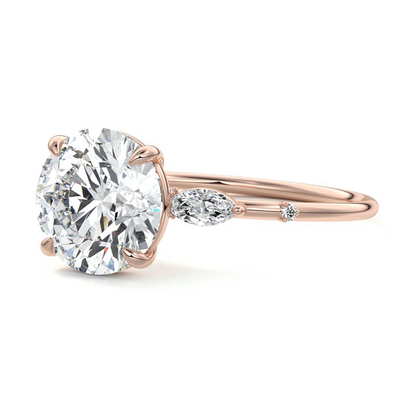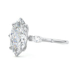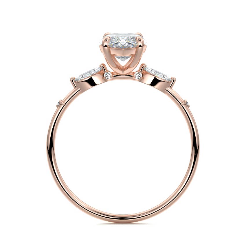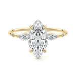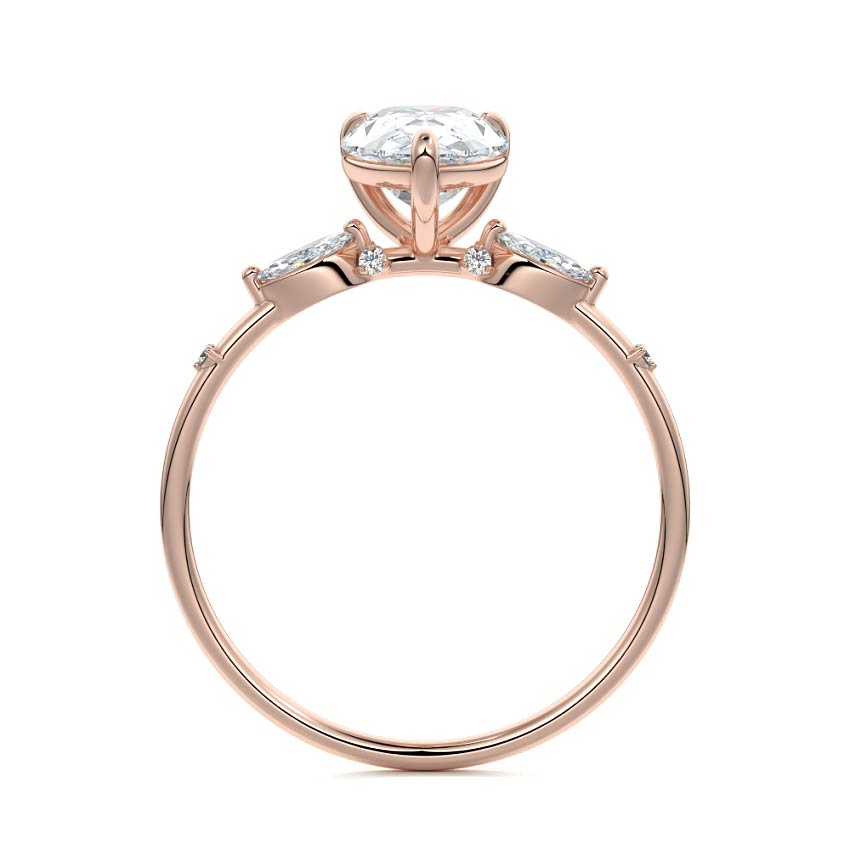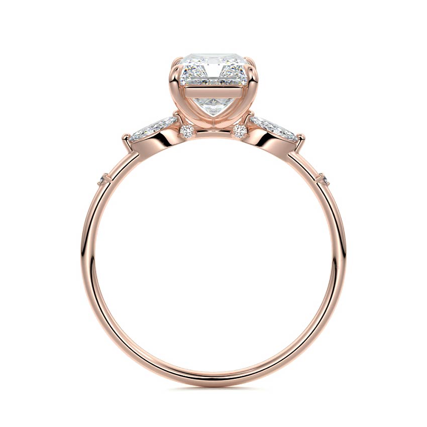 This setting showcases a center stone flanked by a alrger marquise cut diamond surrounded by an array of smaller round diamonds on both sides of the center stone, meticulously arranged in a perfectly symmetrical and harmonious pattern.