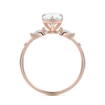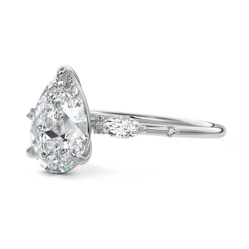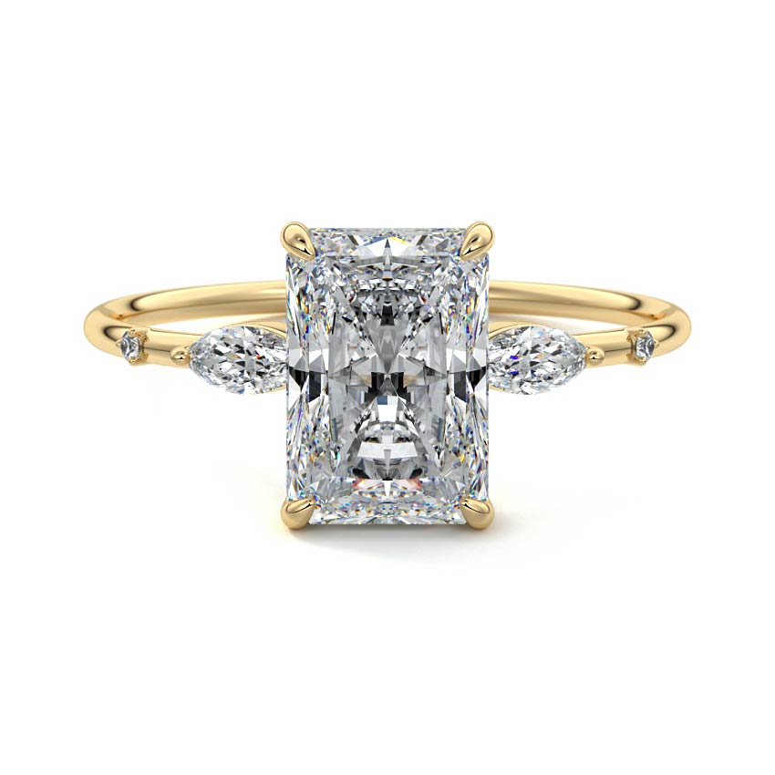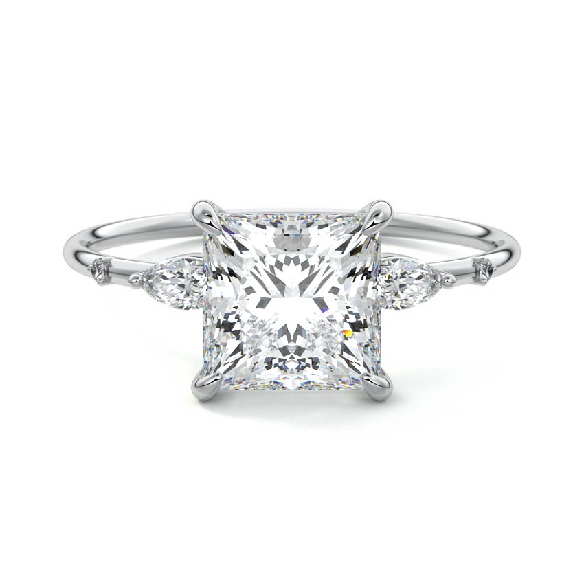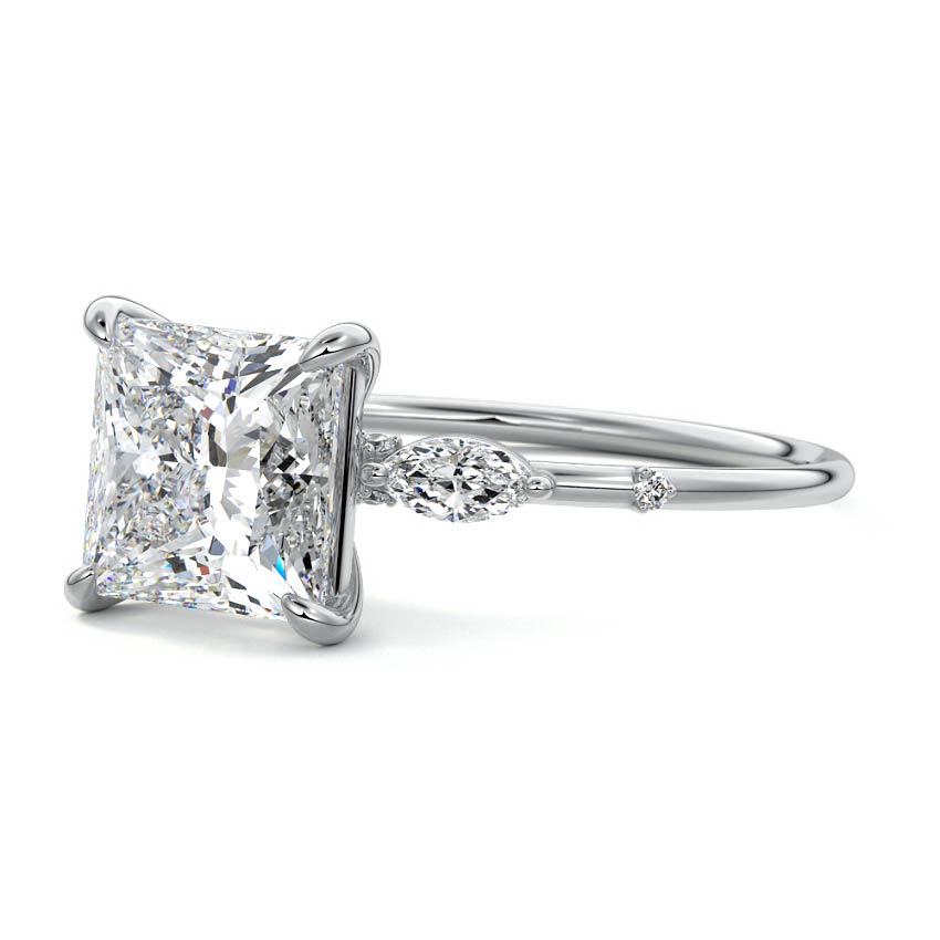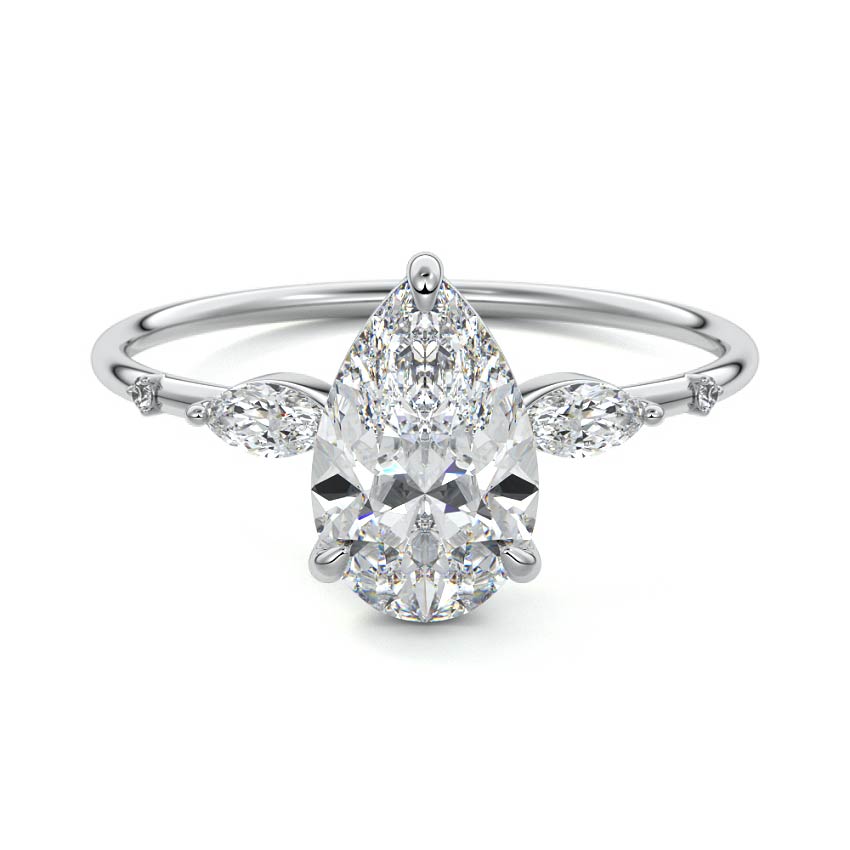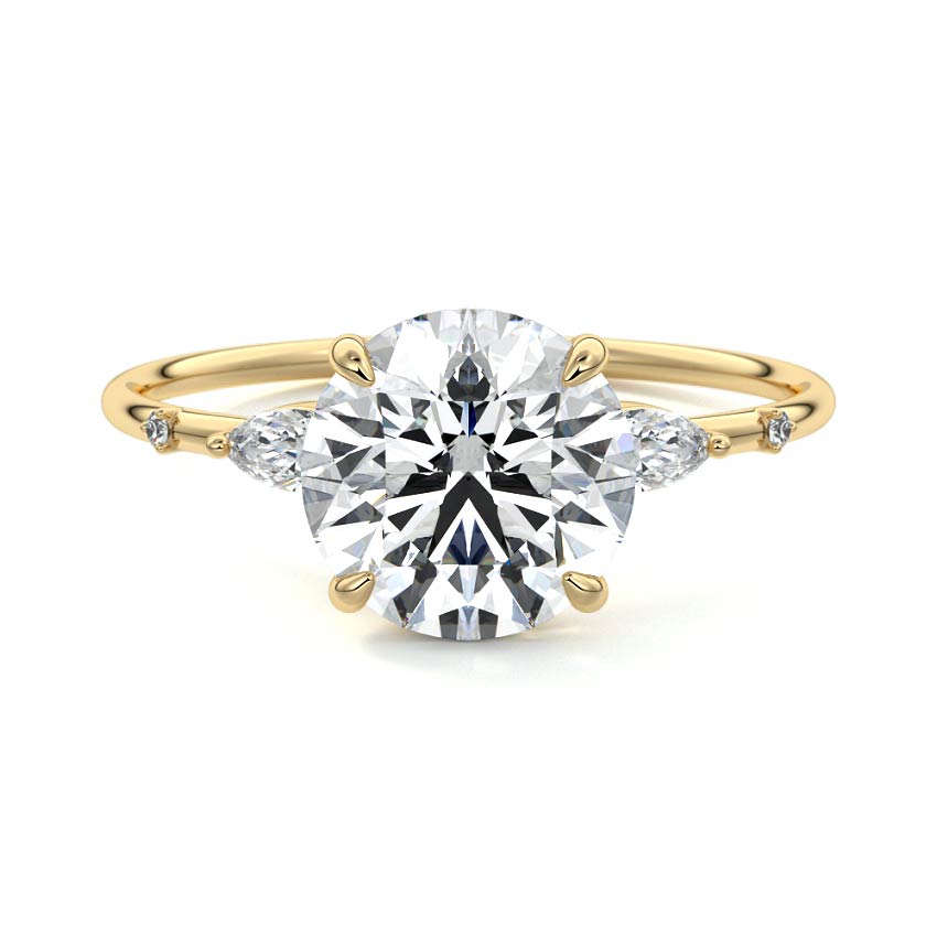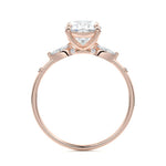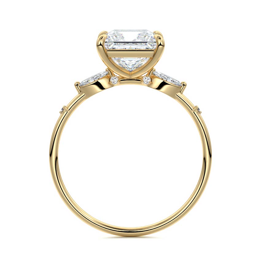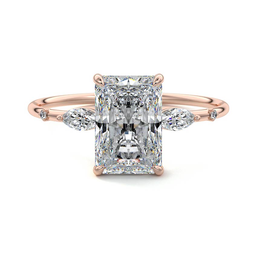 This setting showcases a center stone flanked by a alrger marquise cut diamond surrounded by an array of smaller round diamonds on both sides of the center stone, meticulously arranged in a perfectly symmetrical and harmonious pattern.