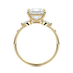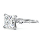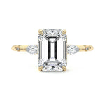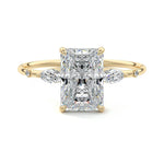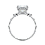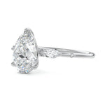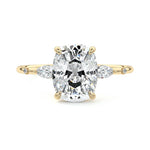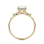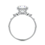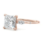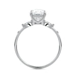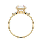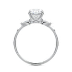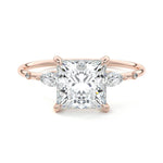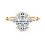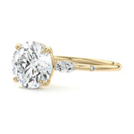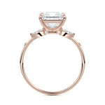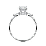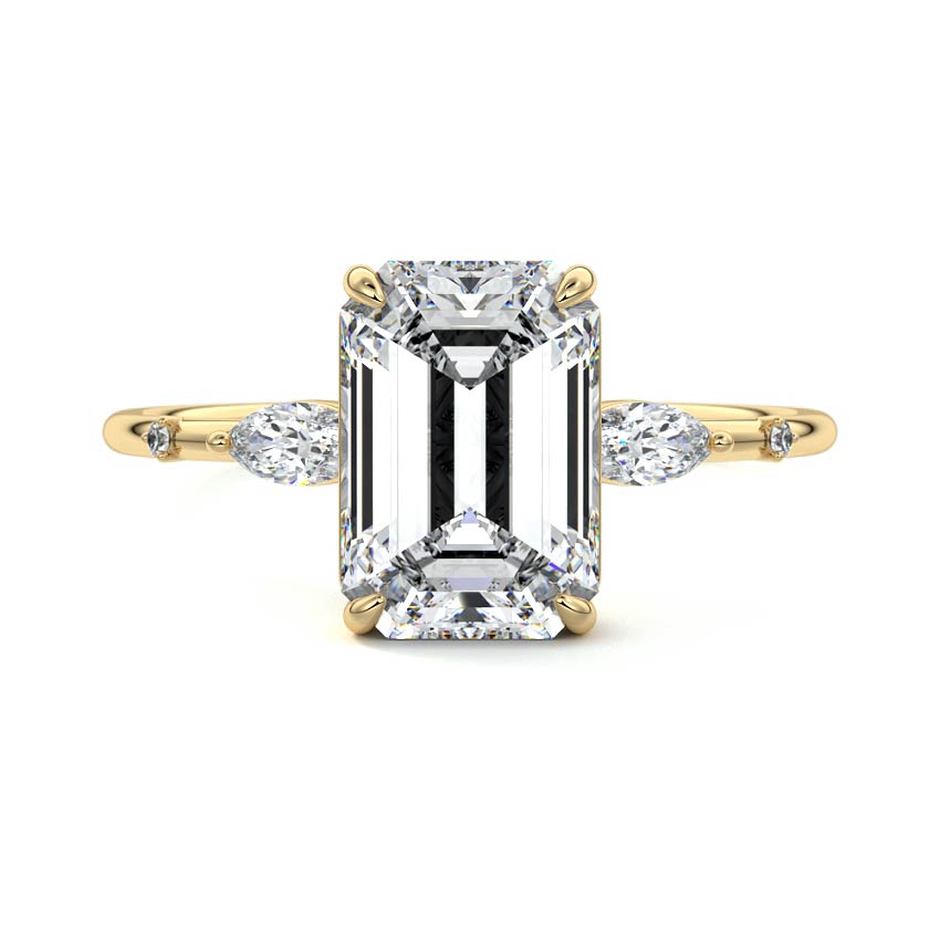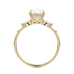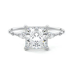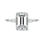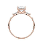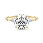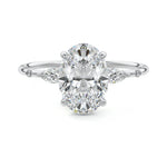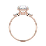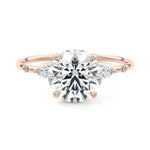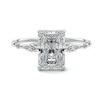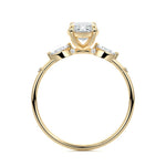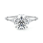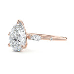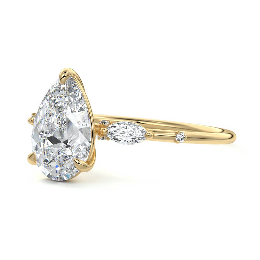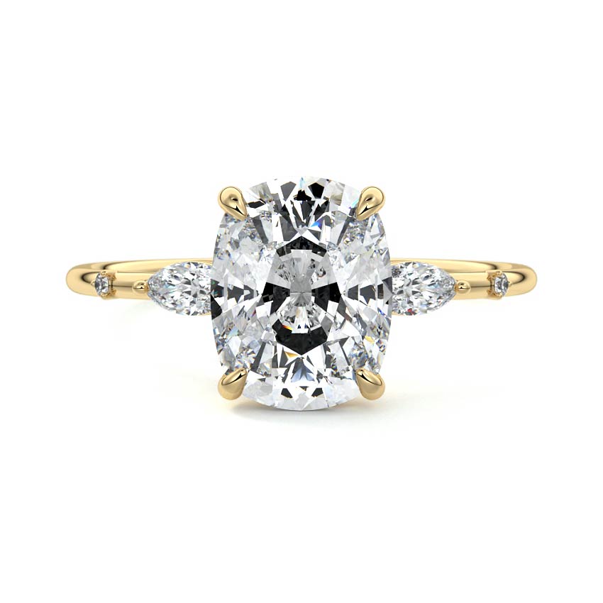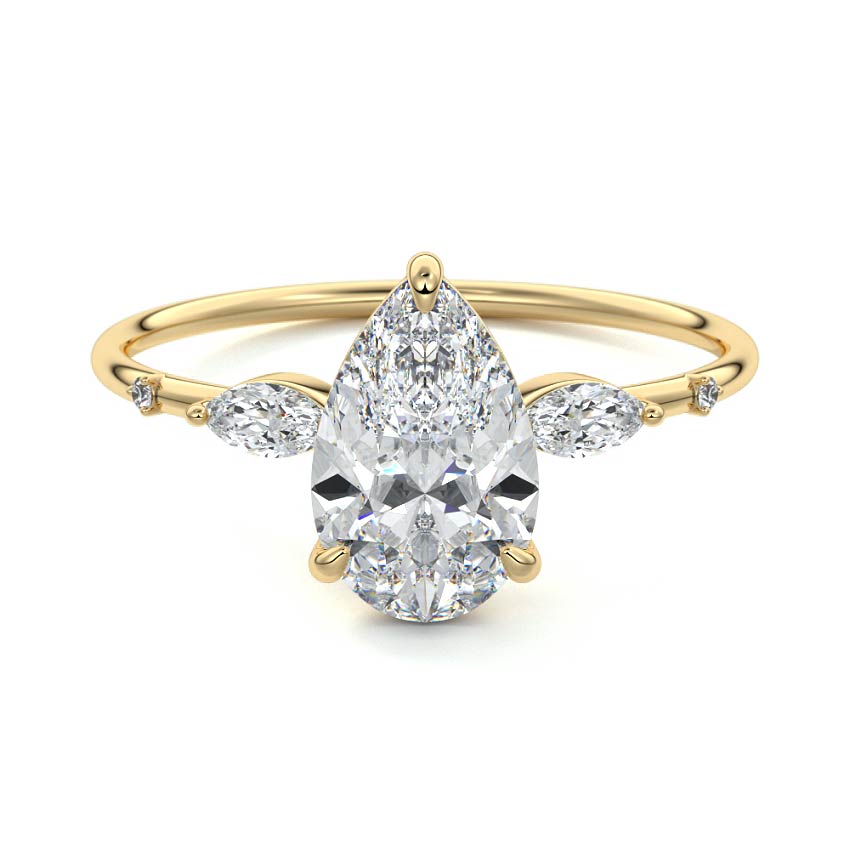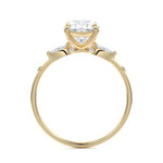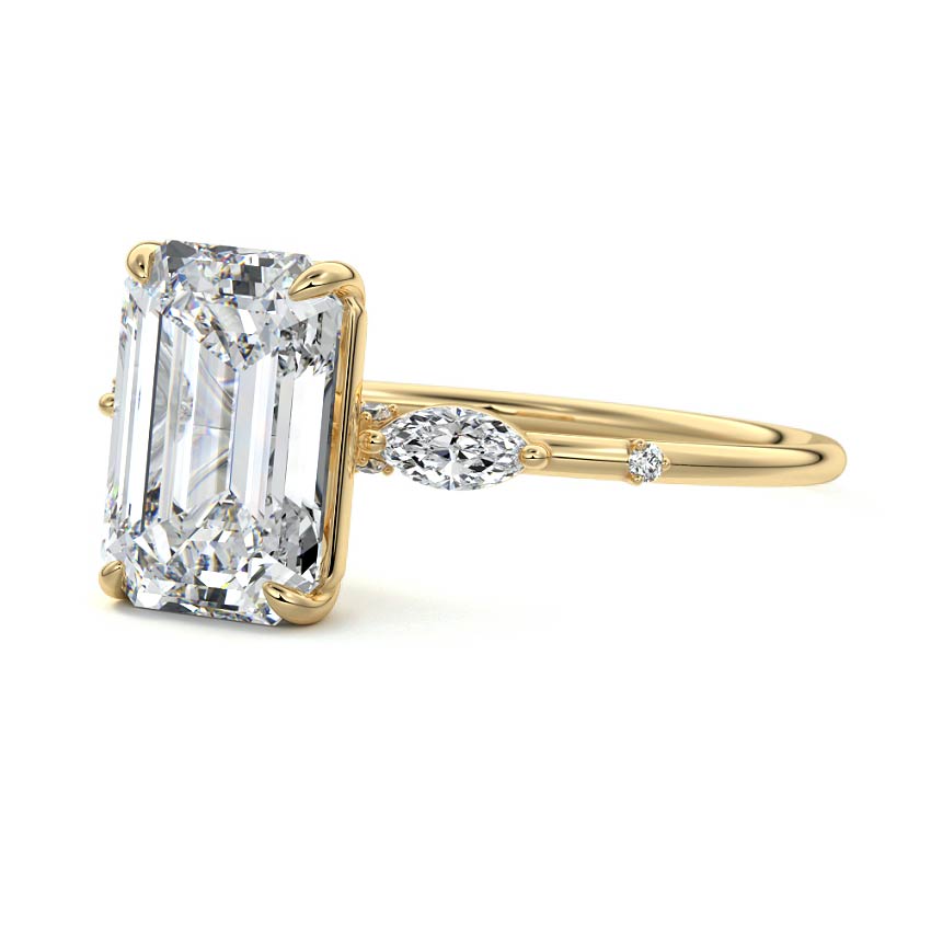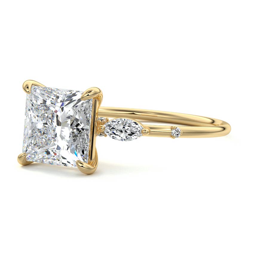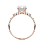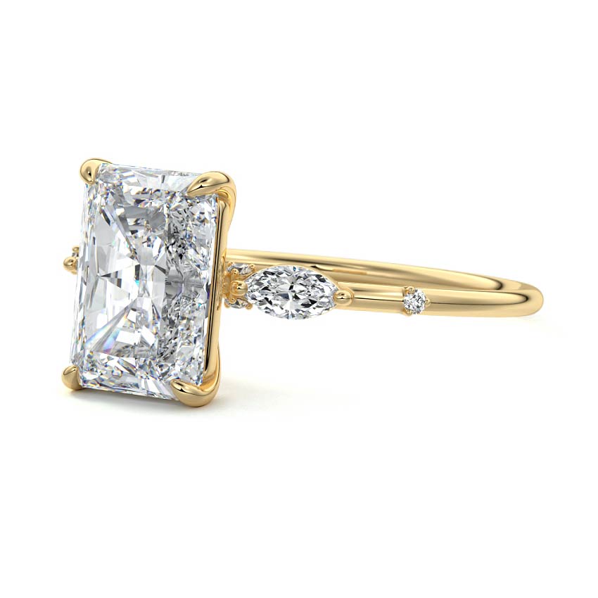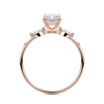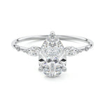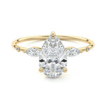 This setting showcases a center stone flanked by a alrger marquise cut diamond surrounded by an array of smaller round diamonds on both sides of the center stone, meticulously arranged in a perfectly symmetrical and harmonious pattern.
