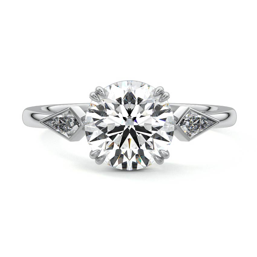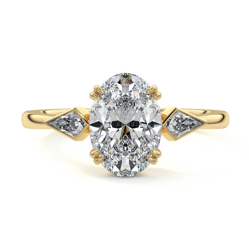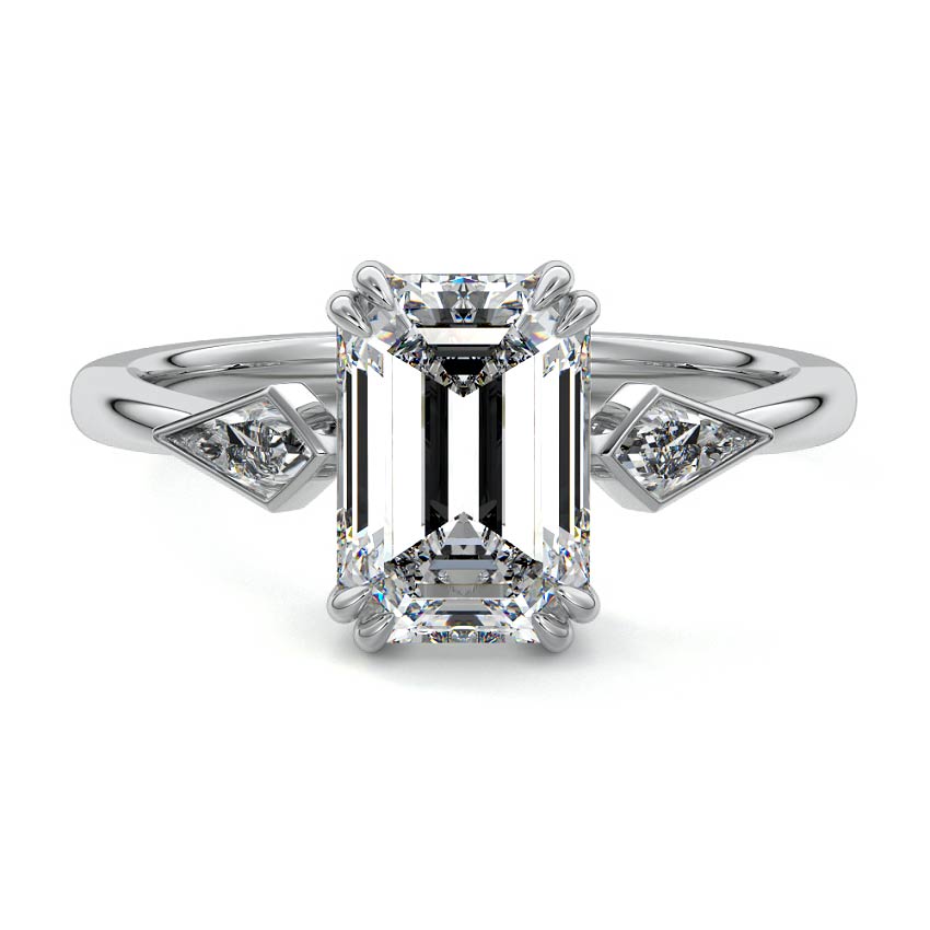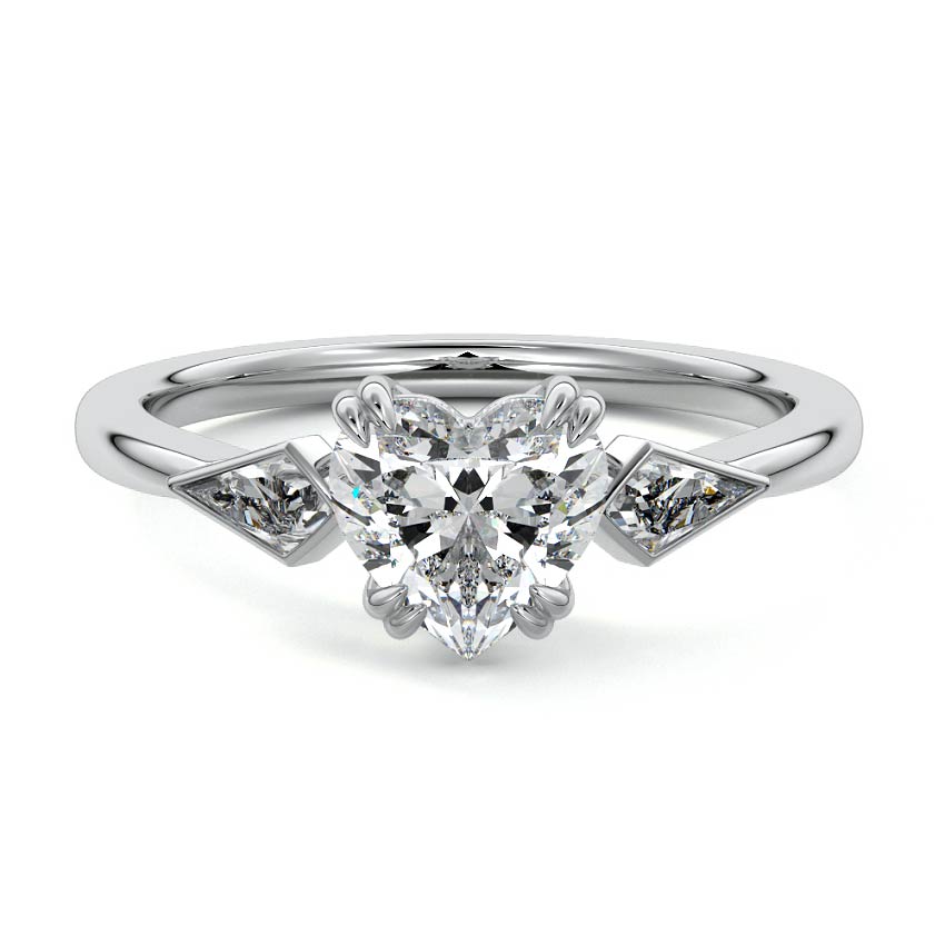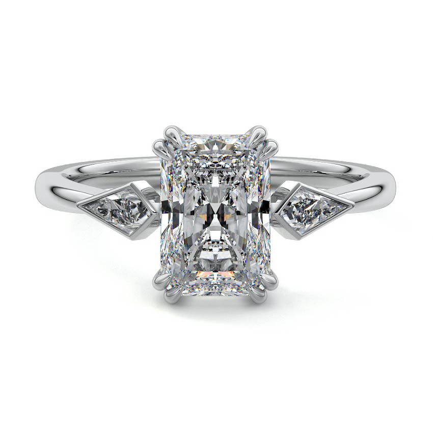 This unique three-stone engagement ring features shield-shaped diamonds, creating a bold and contemporary look. The distinct shape of the diamonds adds an artistic flair, while their strategic arrangement symbolizes strength and unity. This ring beautifully combines modern design with a meaningful representation, making it a perfect choice for those who want a standout piece that tells a story.