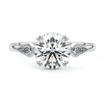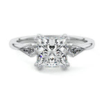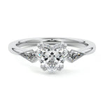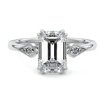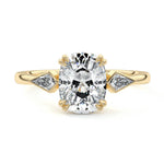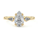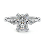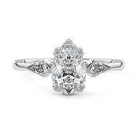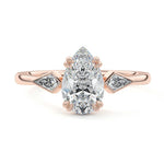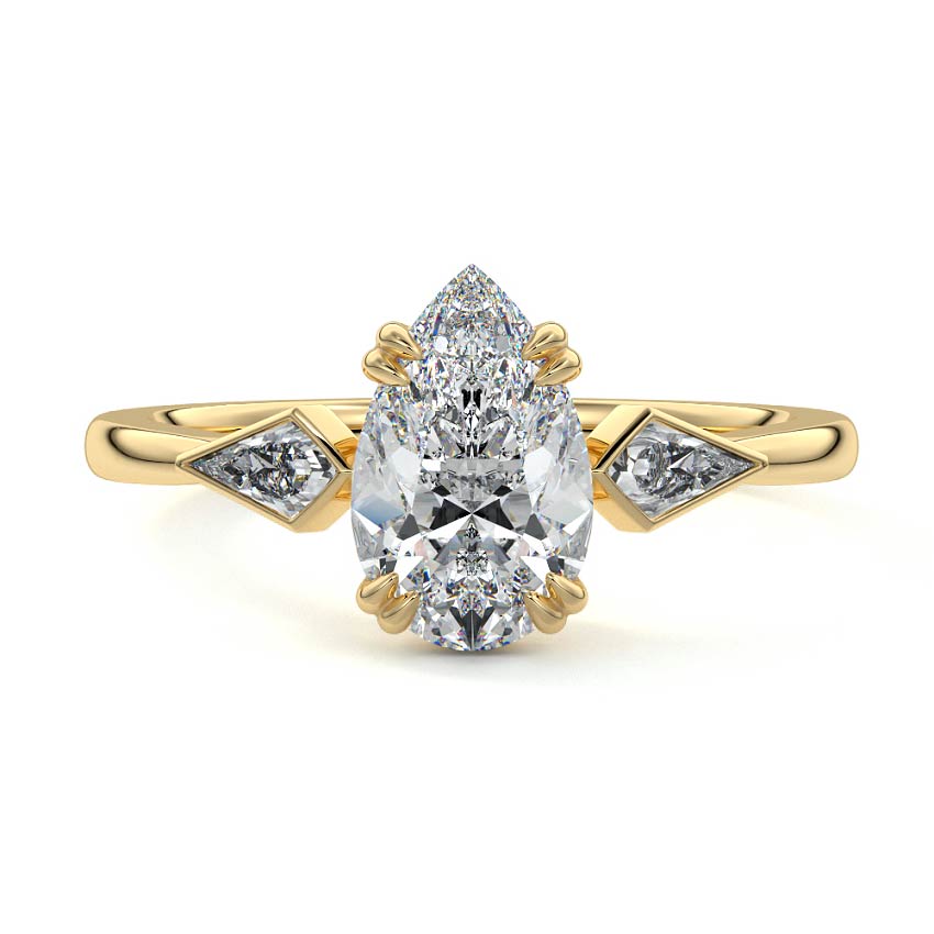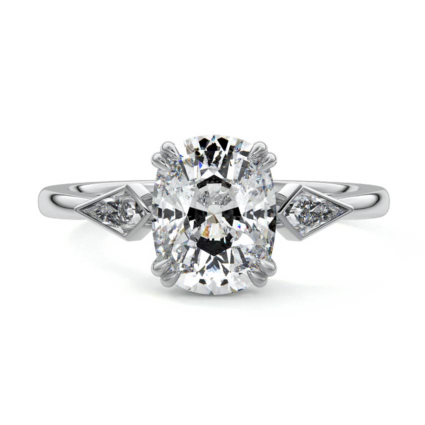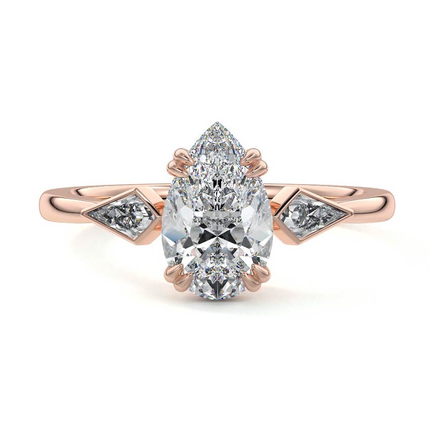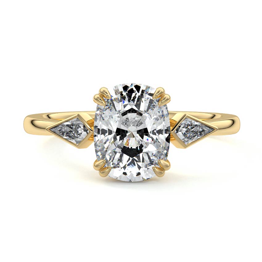 This unique three-stone engagement ring features shield-shaped diamonds, creating a bold and contemporary look. The distinct shape of the diamonds adds an artistic flair, while their strategic arrangement symbolizes strength and unity. This ring beautifully combines modern design with a meaningful representation, making it a perfect choice for those who want a standout piece that tells a story.