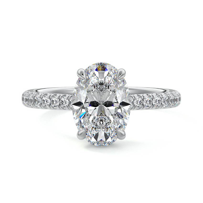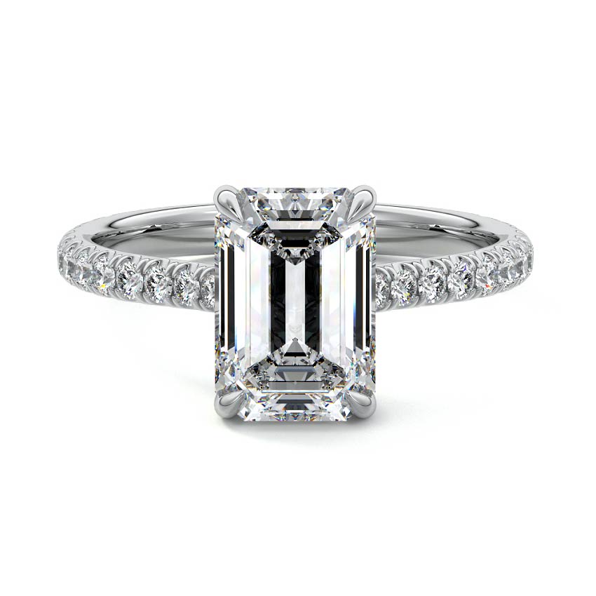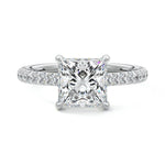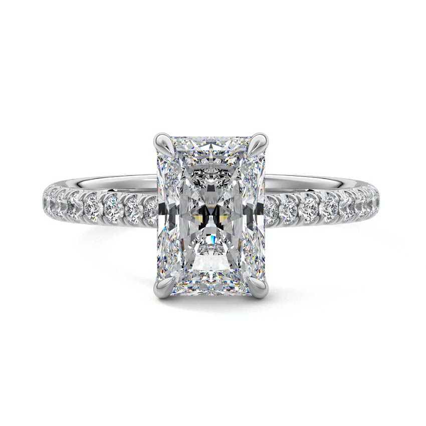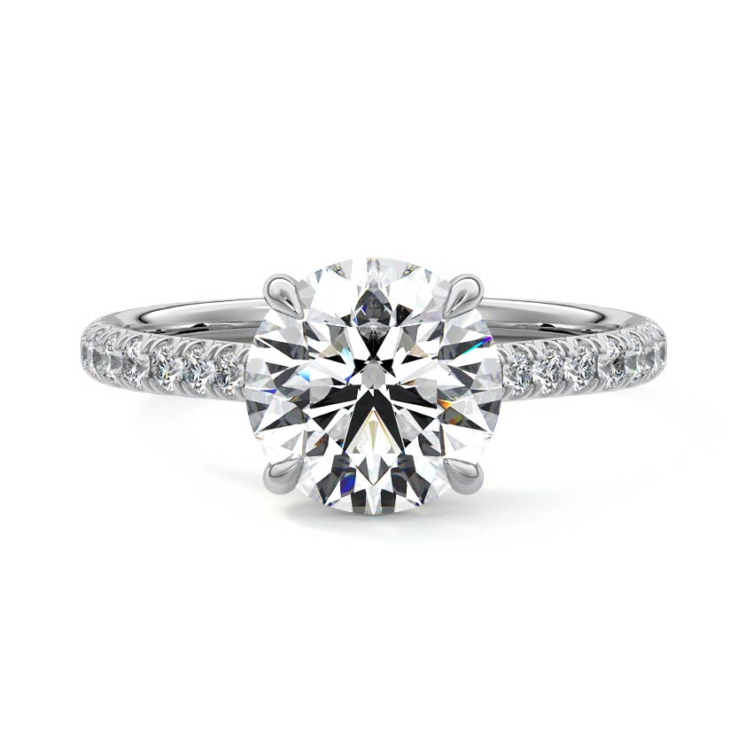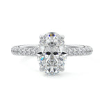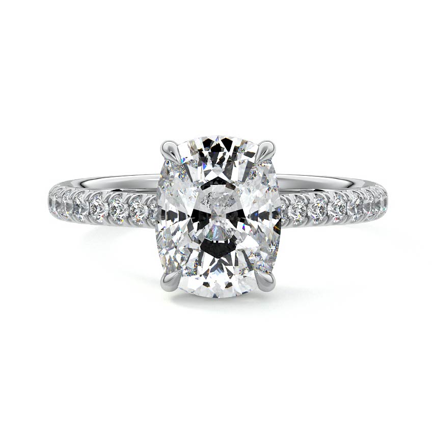 This stunning engagement ring features a double hidden halo that adds extra brilliance around the center stone, enhancing its beauty. The cathedral setting elevates the diamond, creating a striking profile, while the three-quarters pavé band shimmers with sparkling diamonds, offering a continuous shine. This ring elegantly combines modern sophistication with timeless charm, making it a perfect choice for those seeking a dazzling and luxurious engagement ring.