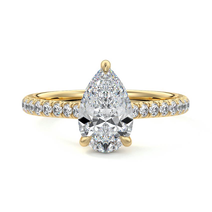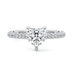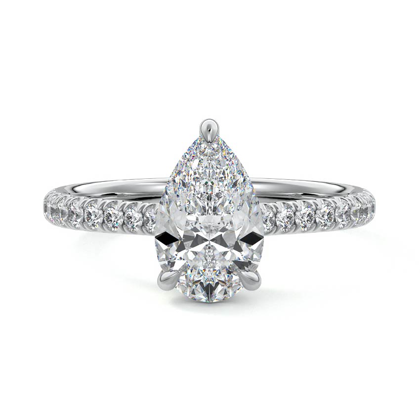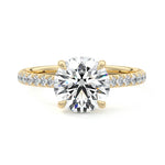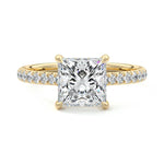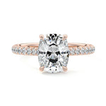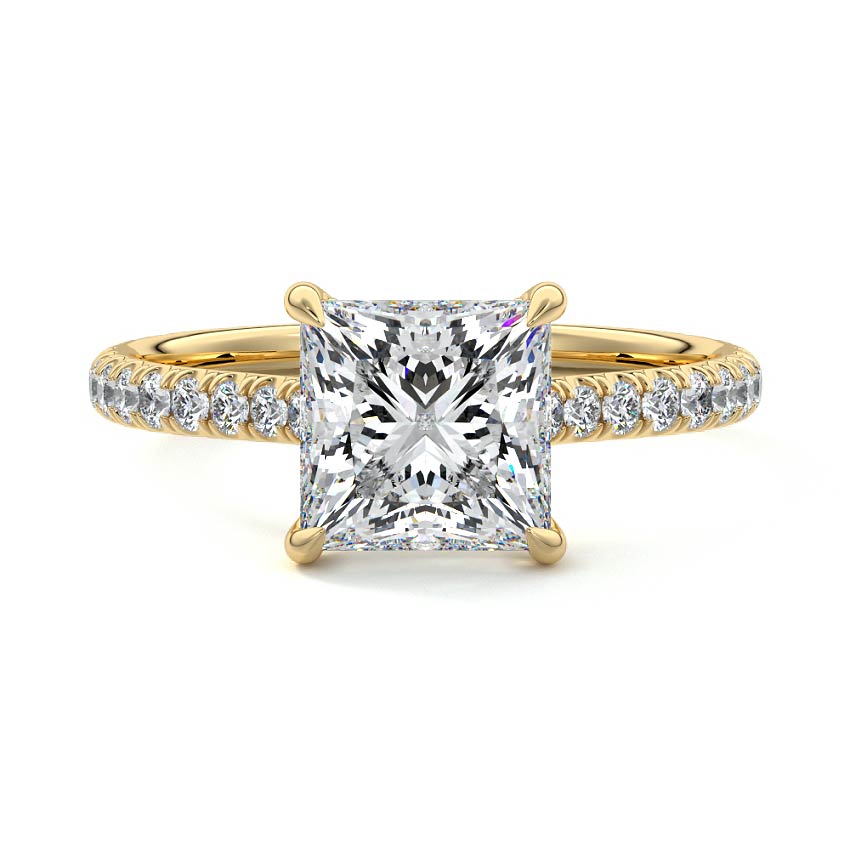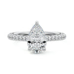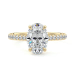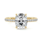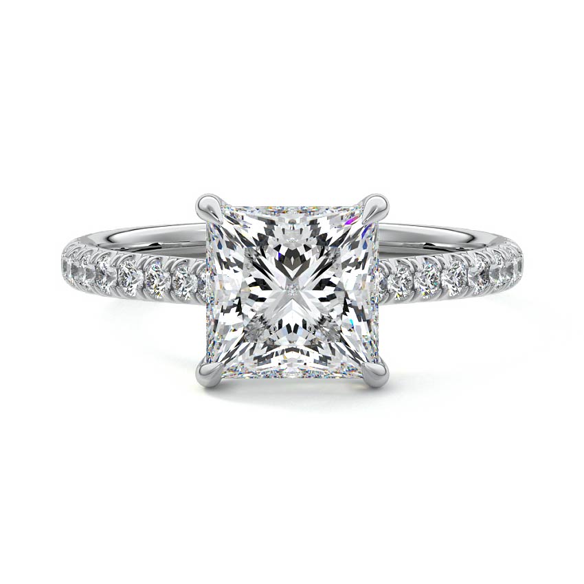 This stunning engagement ring features a double hidden halo that adds extra brilliance around the center stone, enhancing its beauty. The cathedral setting elevates the diamond, creating a striking profile, while the three-quarters pavé band shimmers with sparkling diamonds, offering a continuous shine. This ring elegantly combines modern sophistication with timeless charm, making it a perfect choice for those seeking a dazzling and luxurious engagement ring.